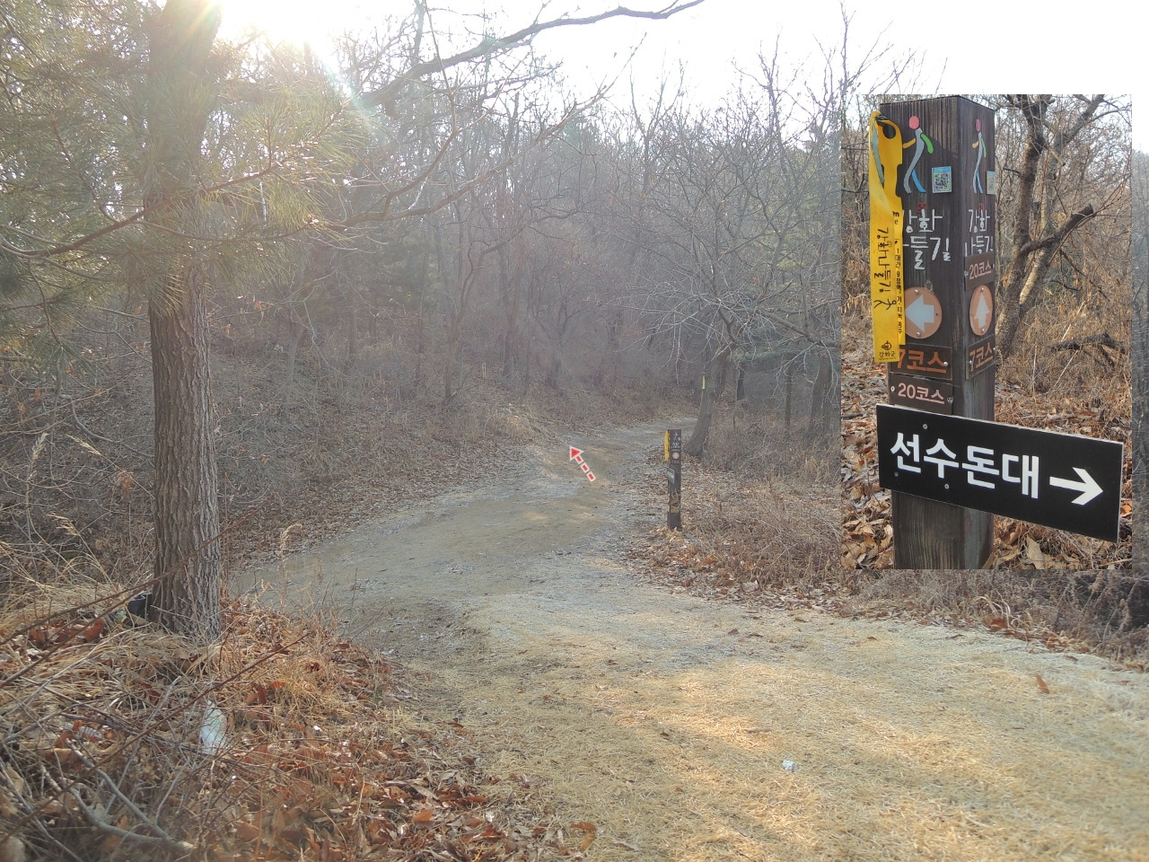 ▲ 선수돈대에서 8분 후, 임도가 보이고, 상봉은 화살표 방향으로 올라갑니다.