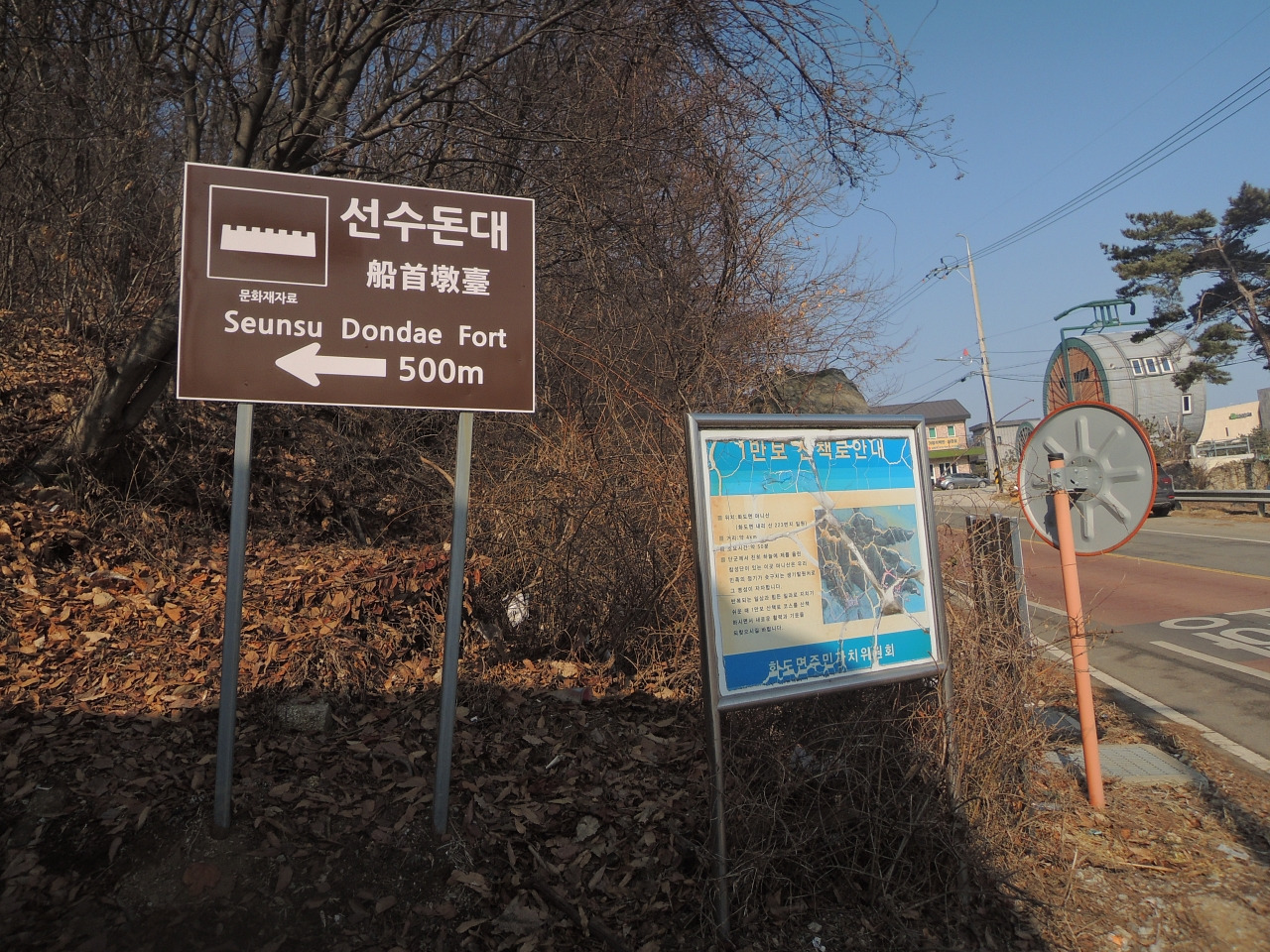 ▲ 위 사진에 보이는 이정표 입니다. 마을입구2 방향이 장곶돈대 방향이고, 선수돈대 방향은 이정표가 없습니다.