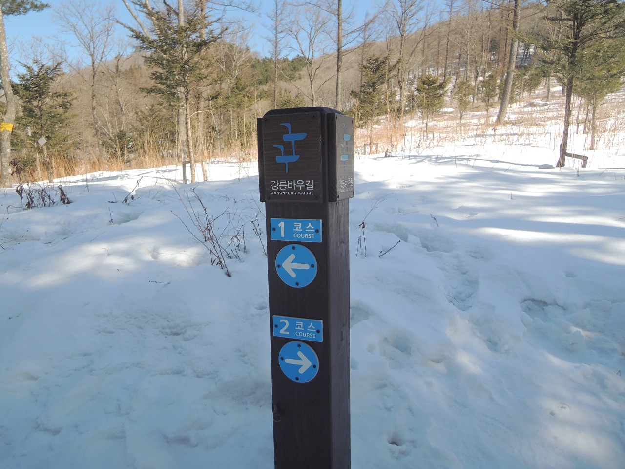 ▲ 국사성황사 갈림길에 있는 강릉바우길 이정목 입니다. 1코스 방향으로 갑니다.