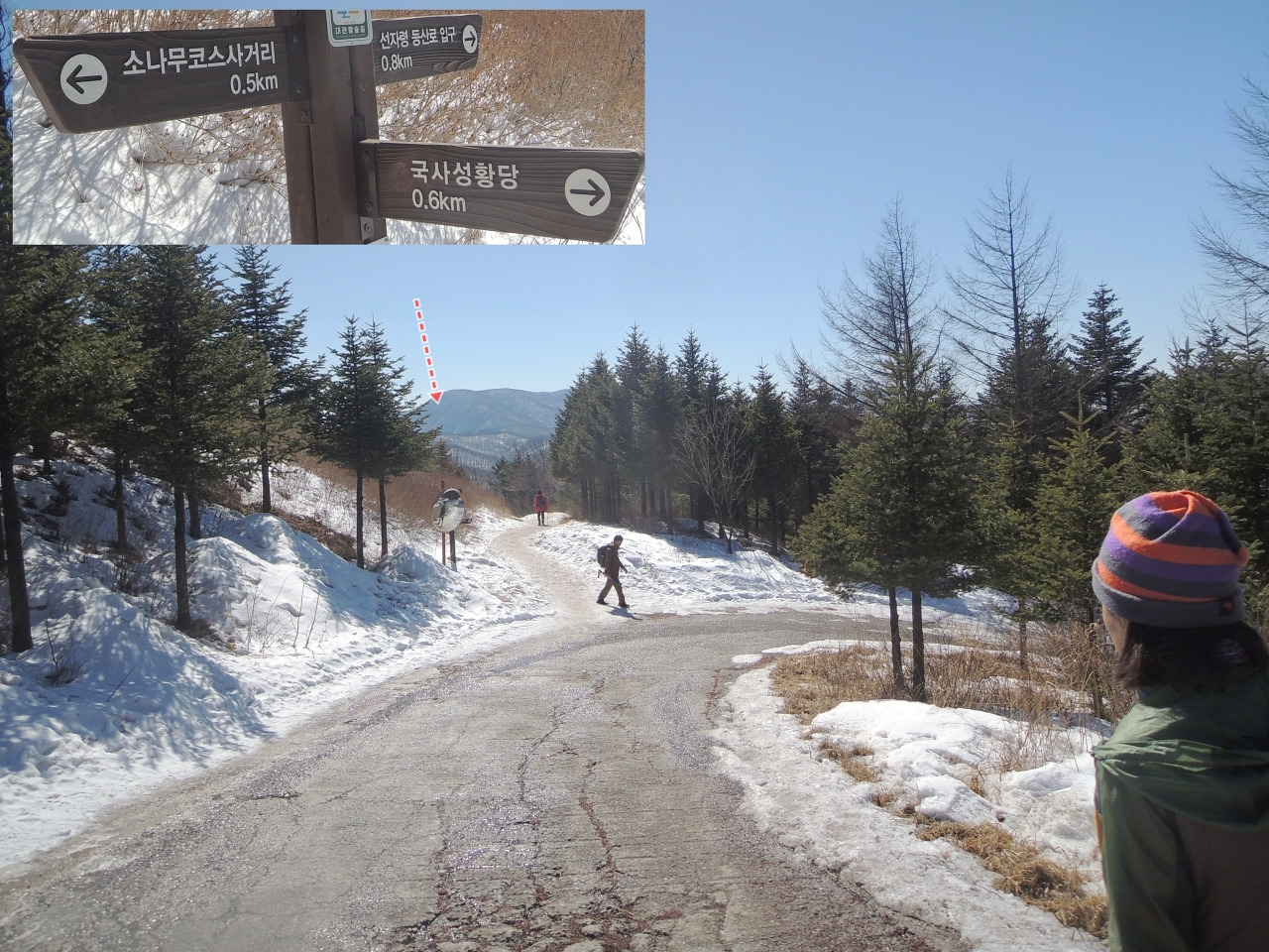 ▲ KT 송신소에서 5분 후 이정표가 보이는데, 선자령등산로 입구 방향으로 직진합니다.