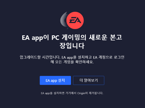 그러면 더이상 EA앱 강제 다운로드 표시 없이 오리진을 계속 사용할 수 있습니다.