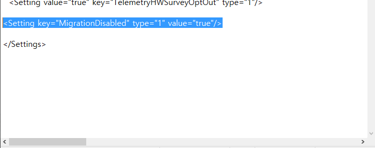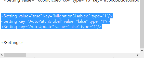 2. 아래를 드래그해서 복사한 후 그림처럼 local.xml 문서 내 하단 </Settings> 앞에 붙여줍니다. 그리고 저장.