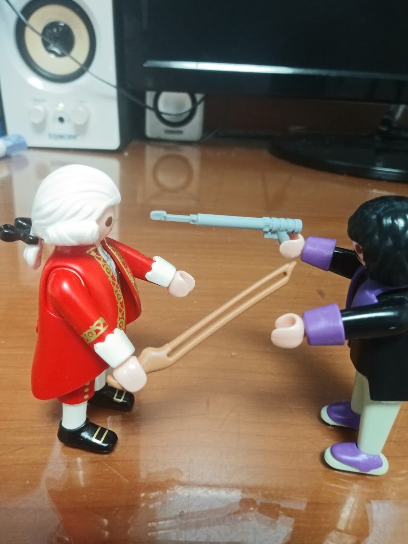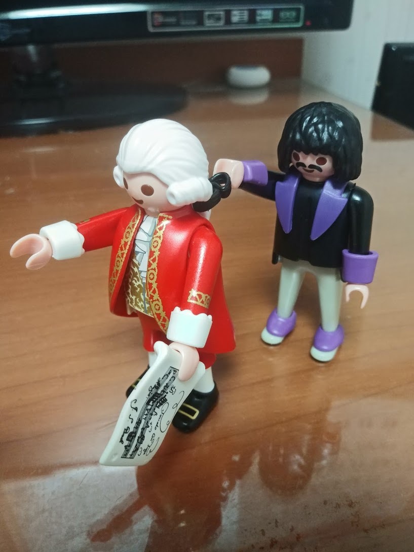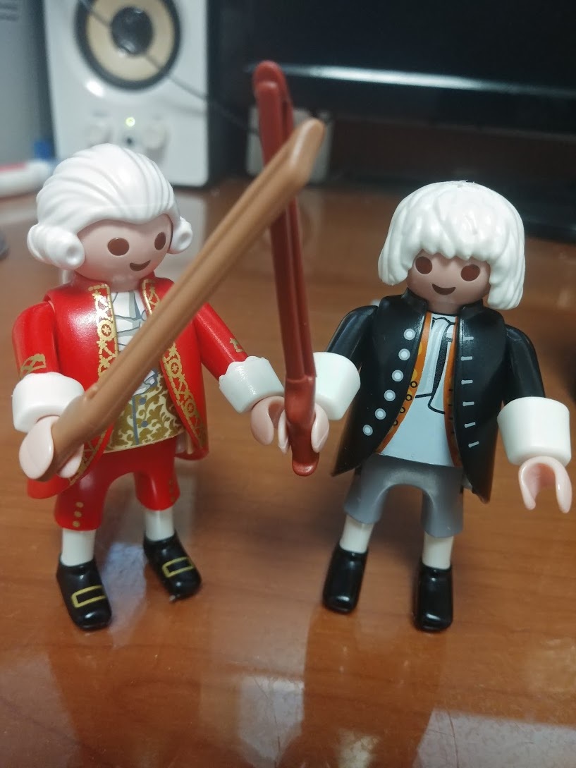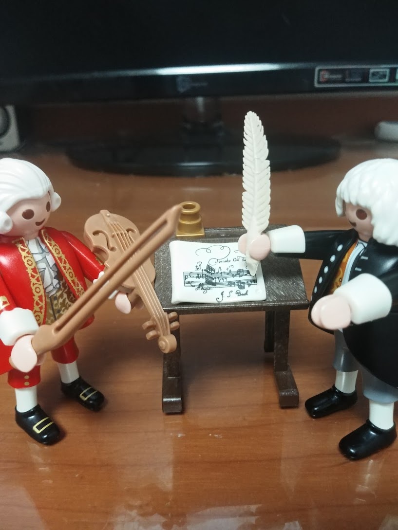 바흐: 이것 봐요 모차르트씨! 제가 모든 피규어들을 위해서라는 새 곡을 만들었소, 봐 주시겠소?