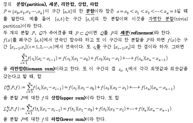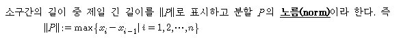 [정의]분할, 세분, 리만합, 상합, 하합, 노름(norm)의 정의 작성자플러스수학|작성시간09.12.01|조회수1,251 목록 댓글 0 글자크기 작게가 글자크기 크게가 다음검색 현재 게시글 추가 기능 열기 북마크 공유하기 신고 센터로 신고 댓글 댓글 0 댓글쓰기 답글쓰기 댓글 리스트