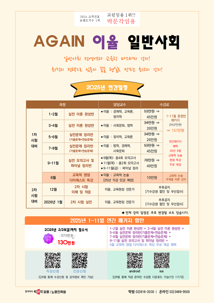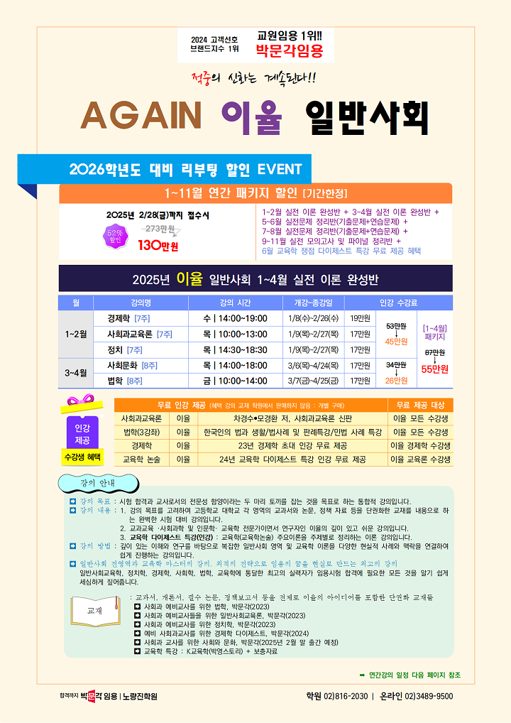 ★이율 일반사회★ <영역별 하모니와 합격!> 2025년 1-4월 강의 및 연간계획 안내! 작성자박문각임용온라인|작성시간24.12.26|조회수65 목록 댓글 0 글자크기 작게가 글자크기 크게가 다음검색 현재 게시글 추가 기능 열기 북마크 공유하기 신고 센터로 신고 댓글 댓글 0 댓글쓰기 답글쓰기 댓글 리스트
