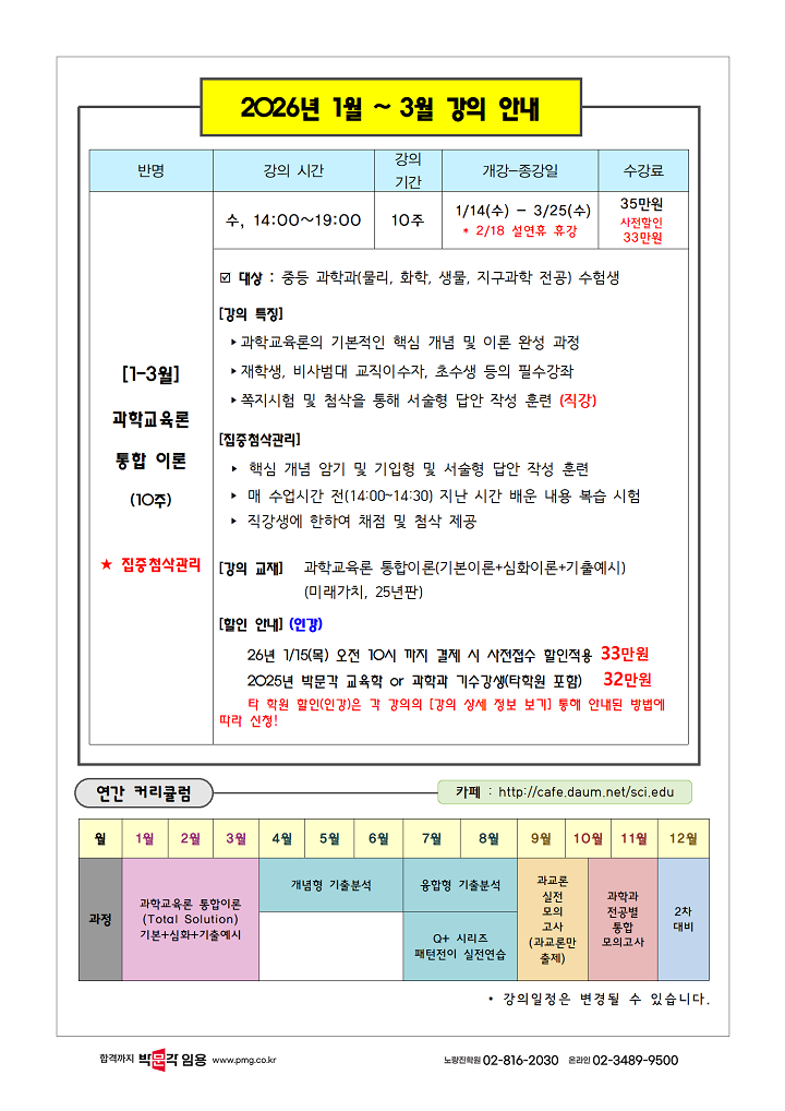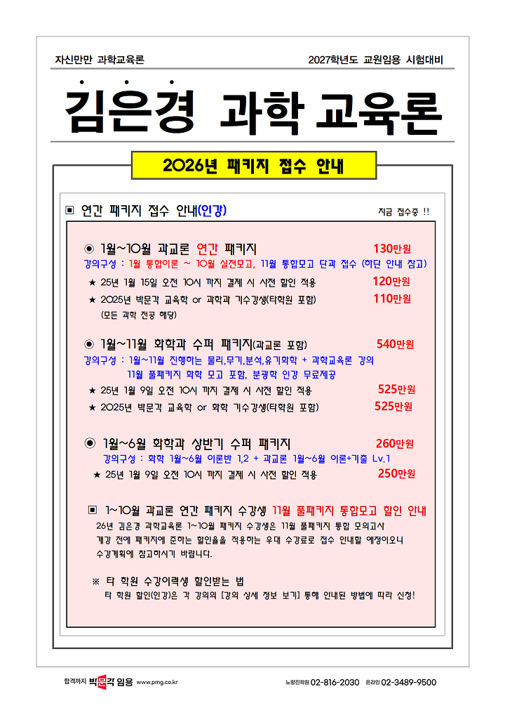 ★김은경 과교론★ <자신만만! 과학교육론!> 2026년 1-3월 강의 및 연간 패키지 안내! 작성자박문각임용온라인|작성시간25.12.26|조회수5 목록 댓글 0 글자크기 작게가 글자크기 크게가 다음검색 현재 게시글 추가 기능 열기 북마크 공유하기 신고 센터로 신고 댓글 댓글 0 댓글쓰기 답글쓰기 댓글 리스트