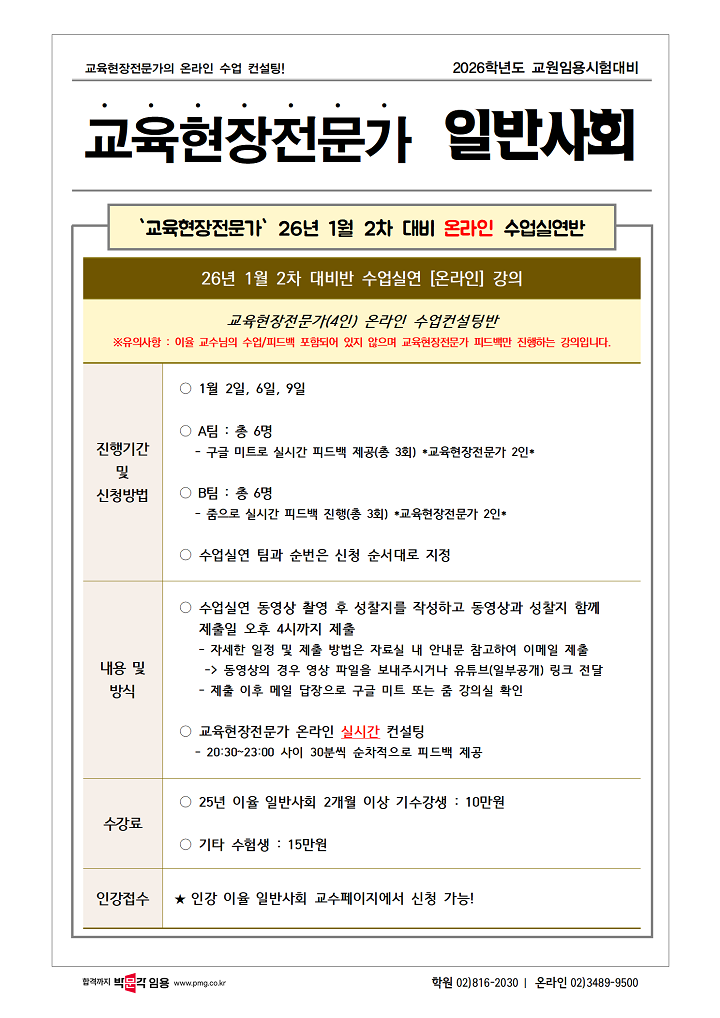 ★일반사회 - 현장전문가★ 2026학년도 대비 1월 2차 대비반(인강) 안내! 작성자박문각임용온라인|작성시간25.12.29|조회수9 목록 댓글 0 글자크기 작게가 글자크기 크게가 [클릭] 👉 [직강 신청하러 가기]※이율 교수님께서 진행하시는 직강 2차 대비반은 위 링크로 신청해주시면 됩니다. [클릭] 👉 [인강 신청하러 가기]※해당 강의는 교육현장전문가분들이 피드백만 진행해주시는 강의입니다.(이율 교수님 강의/피드백 X) 다음검색 현재 게시글 추가 기능 열기 북마크 공유하기 신고 센터로 신고 댓글 댓글 0 댓글쓰기 답글쓰기 댓글 리스트