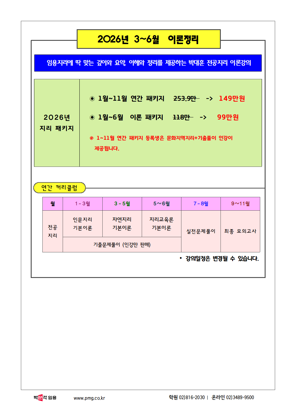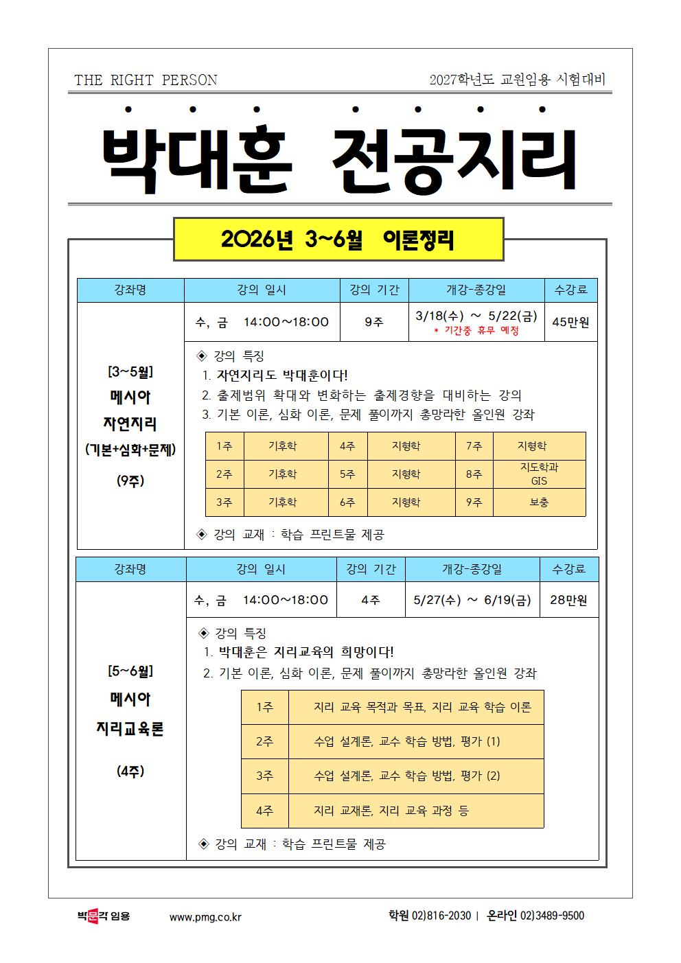 ★박대훈 전공지리★ 2026년 3-5월 및 5-6월 강의 일정 안내! (인강) 작성자박문각임용온라인|작성시간26.02.27|조회수24 목록 댓글 0 글자크기 작게가 글자크기 크게가 [클릭!] 👉 인강 신청하기 [클릭!] 👉 직강 신청하기 [클릭!] 👉 [2027학년도 대비 초수생을 위한 합격전략설명회!] 다음검색 현재 게시글 추가 기능 열기 북마크 공유하기 신고 센터로 신고 댓글 댓글 0 댓글쓰기 답글쓰기 댓글 리스트