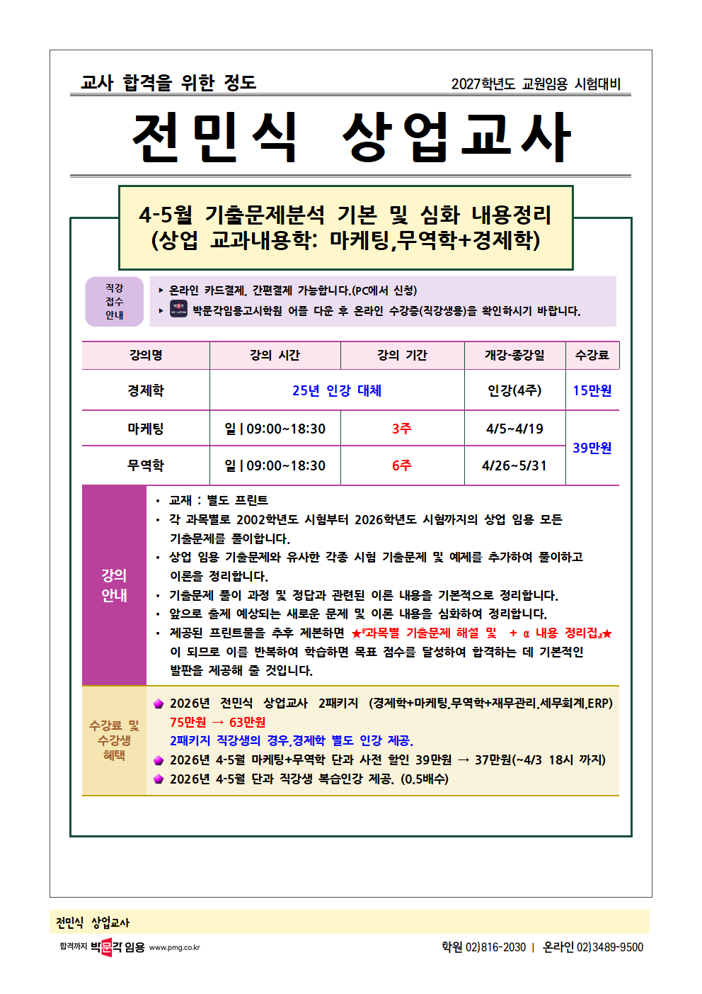 ★전민식 상업★ 2026년 4-5월 및 패키지 강의 안내(인강) 작성자박문각임용온라인|작성시간26.03.20|조회수6 목록 댓글 0 글자크기 작게가 글자크기 크게가 박문각임용온라인 전민식 상업 페이지 바로가기[클릭] 다음검색 현재 게시글 추가 기능 열기 북마크 공유하기 신고 센터로 신고 댓글 댓글 0 댓글쓰기 답글쓰기 댓글 리스트