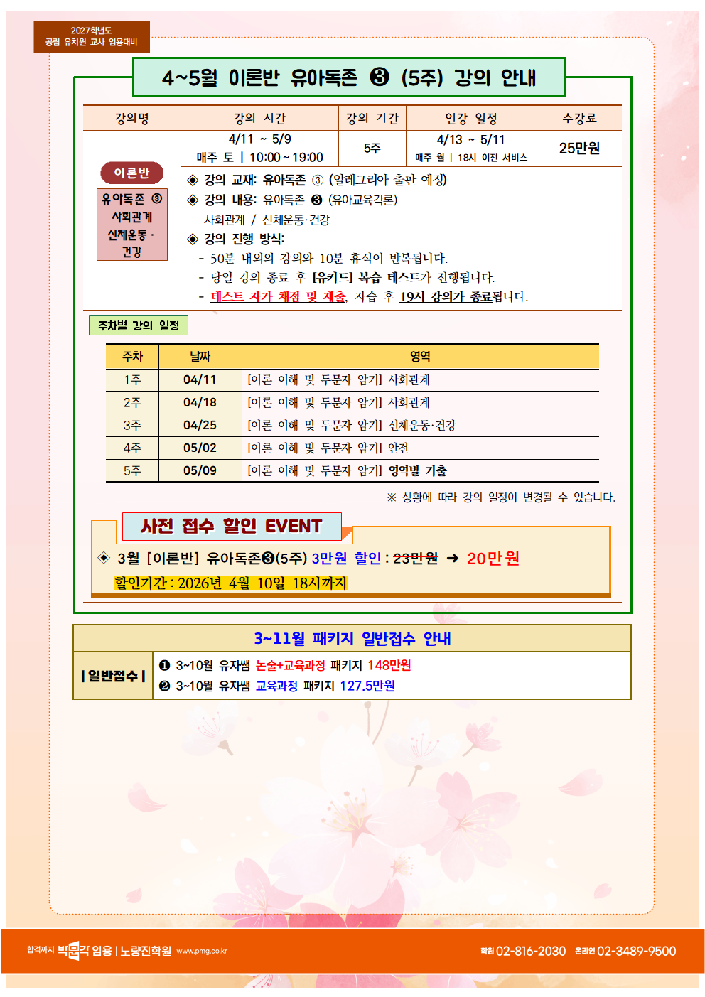 ★유자쌤 유아★ 2026년 4-5월 유아독존③(사회/신체.건강)강의 안내(인강) 작성자박문각임용온라인|작성시간26.03.30|조회수2 목록 댓글 0 글자크기 작게가 글자크기 크게가 🍊인강 수강신청하러가기🍊 다음검색 현재 게시글 추가 기능 열기 북마크 공유하기 신고 센터로 신고 댓글 댓글 0 댓글쓰기 답글쓰기 댓글 리스트
