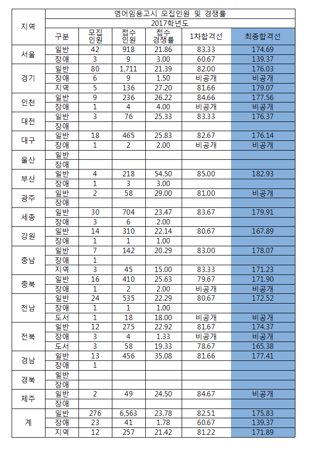 2017 영어임용고시 최종합격점수 안내 작성자박문각임용고시학원|작성시간17.02.11|조회수57 목록 댓글 0 글자크기 작게가 글자크기 크게가 2017 영어임용고시 최종합격점수 <블로그에서도 확인하기 클릭> <2016학년도 티오 확인하기 클릭> <2014~2015학년도 티오 확인하기 클릭> 다음검색 현재 게시글 추가 기능 열기 북마크 공유하기 신고 센터로 신고 댓글 댓글 0 댓글쓰기 답글쓰기 댓글 리스트