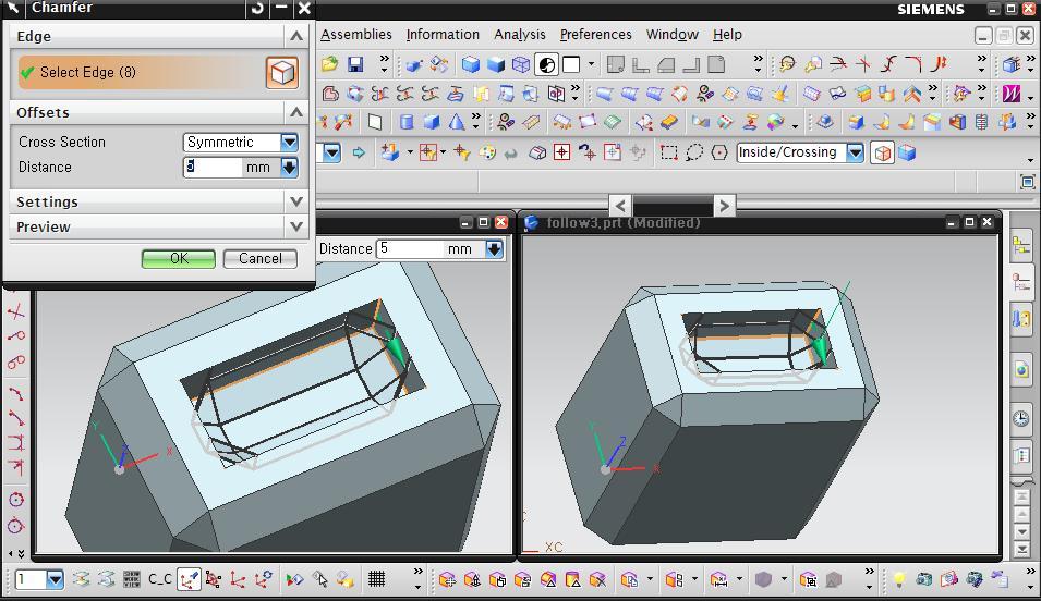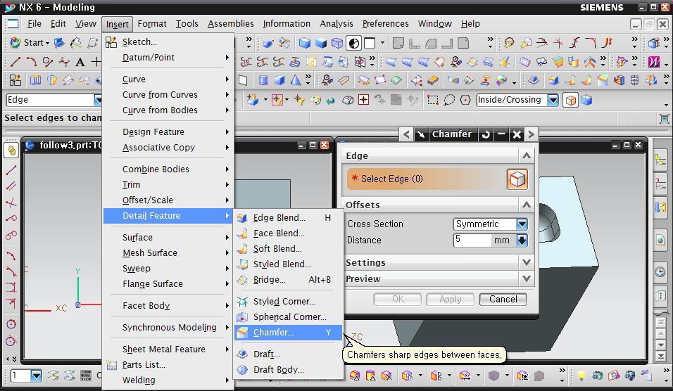 단축키로는 "Y", 메뉴로는 Insert / Detail Feature / Chamfer입니다.