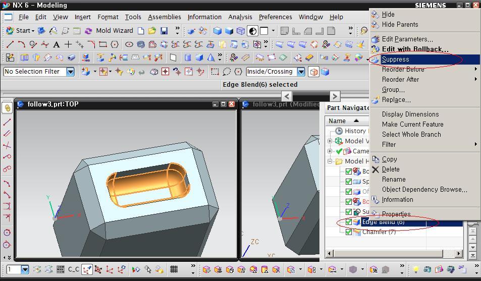 6. 파트 네비게이터의 Edge Blend의 앞쪽에 체크된 것을 풀어주거나, 오른쪽 마우스를 눌러서 Suppress를 해 봅니다. 블랜드 했던 면이 감쪽같이 사라졌습니다. 다시 체크하면, 또 나타납니다.