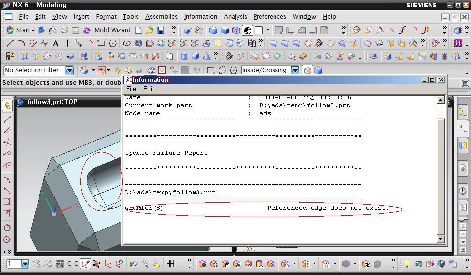 8. 챔퍼가 잘 들어간 것을 확인했으면, 아까와 마찬가지로 Part Navigator에 가서 아까 기능을 없앴던 Edge Blend를 활성화 해 봅니다. 어떻게 되나요? 정보창이 뜨면서 C는 없어지고, R이나오게 됩니다.