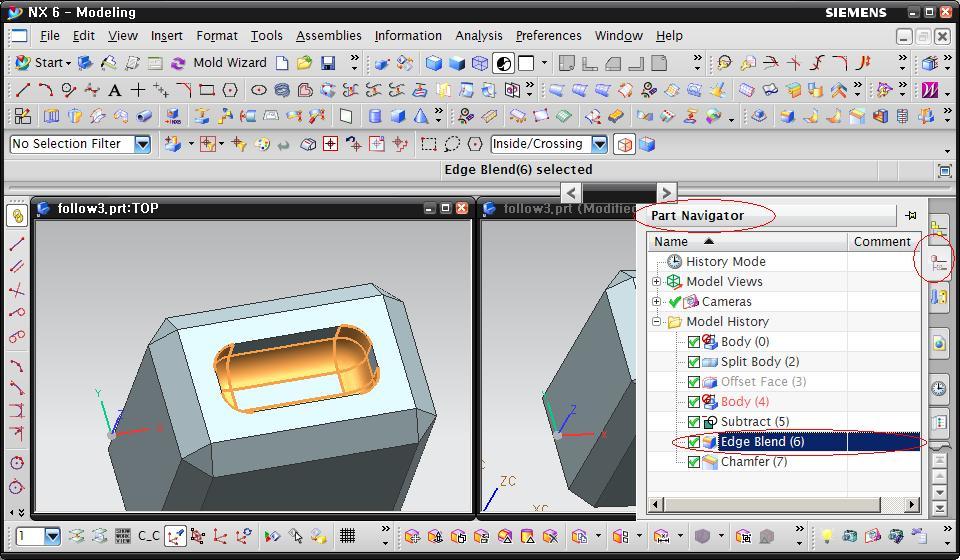 5. 저번에 만들었던 블랜드를 없애 보도록 하겠습니다. 우선, 오른쪽이나 왼쪽끝에 보시면, Part Navigator 라고 있습니다. 그걸 클릭해 보시면, Edge Blend를 한 history를 볼 수 있습니다.