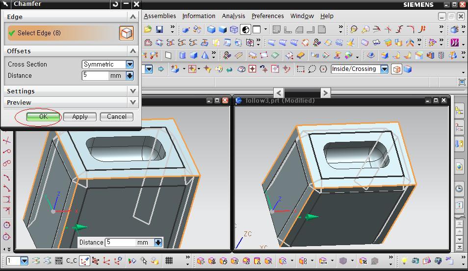 7. 이번에는 방금 없앴던 Edge Blend 대신에 Chamfer를 해 보겠습니다.