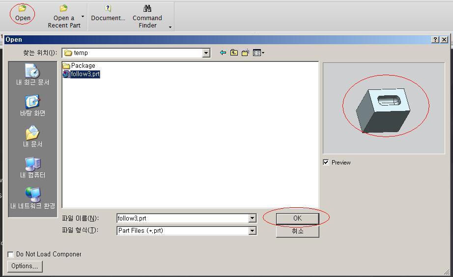 UG를 실행 한 후 Open을 하여 저번에장에 만들었던 프로젝트(prt)파일을 불러옵니다.