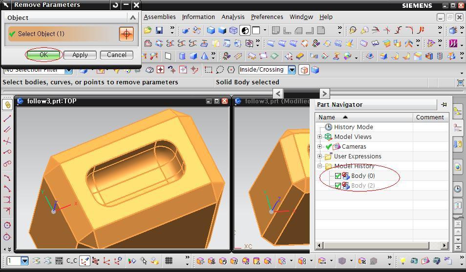 9. 히스토리를 1개씩 없애려면 Part Navigator에서 오른쪽 마우스를 누르고, Delete를 하시면 되고, 전체 히스토리를 없애고자 하는 분들은 Remove Parameter를 하시면 됩니다.