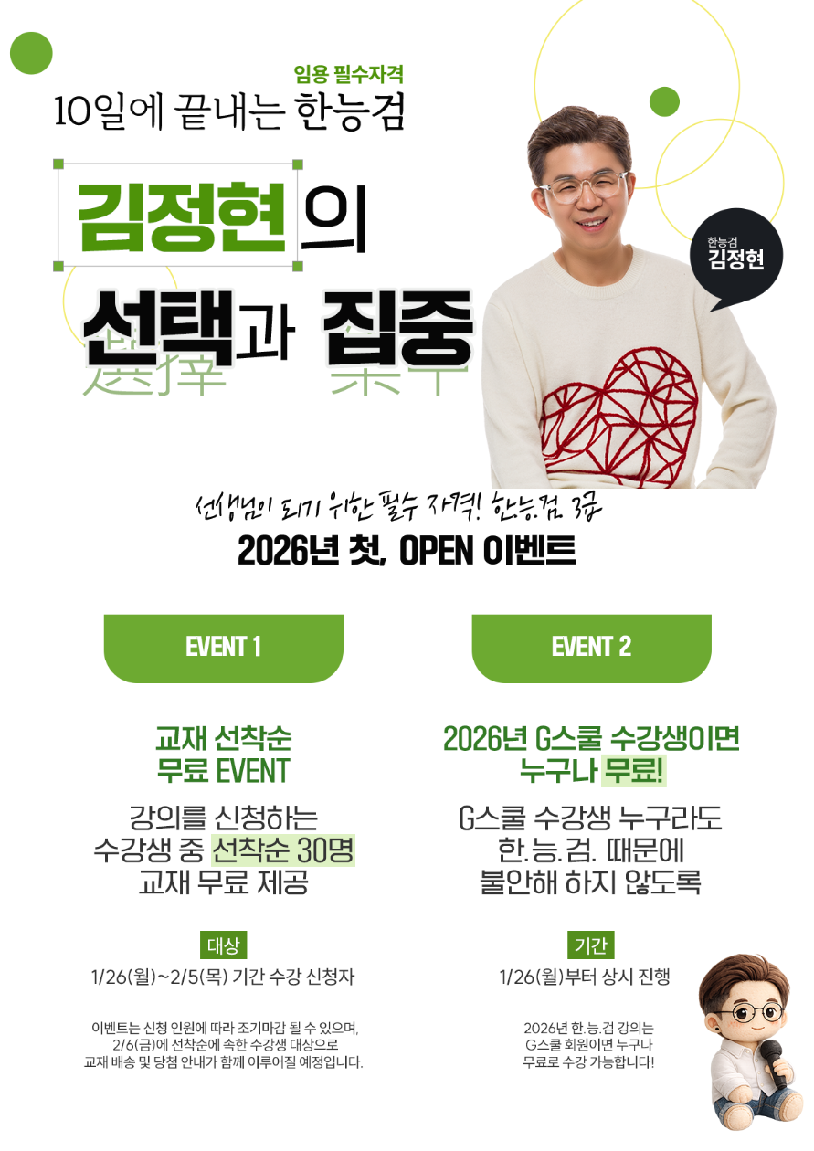 [G스쿨][한.능.검] 10일 완성 프로젝트! 선착순 교재 무료 증정&수강료 무료 이벤트! 작성자G스쿨|작성시간26.01.23|조회수48 목록 댓글 0 글자크기 작게가 글자크기 크게가 다음검색 현재 게시글 추가 기능 열기 북마크 신고 센터로 신고 댓글 댓글 0 댓글쓰기 답글쓰기 댓글 리스트