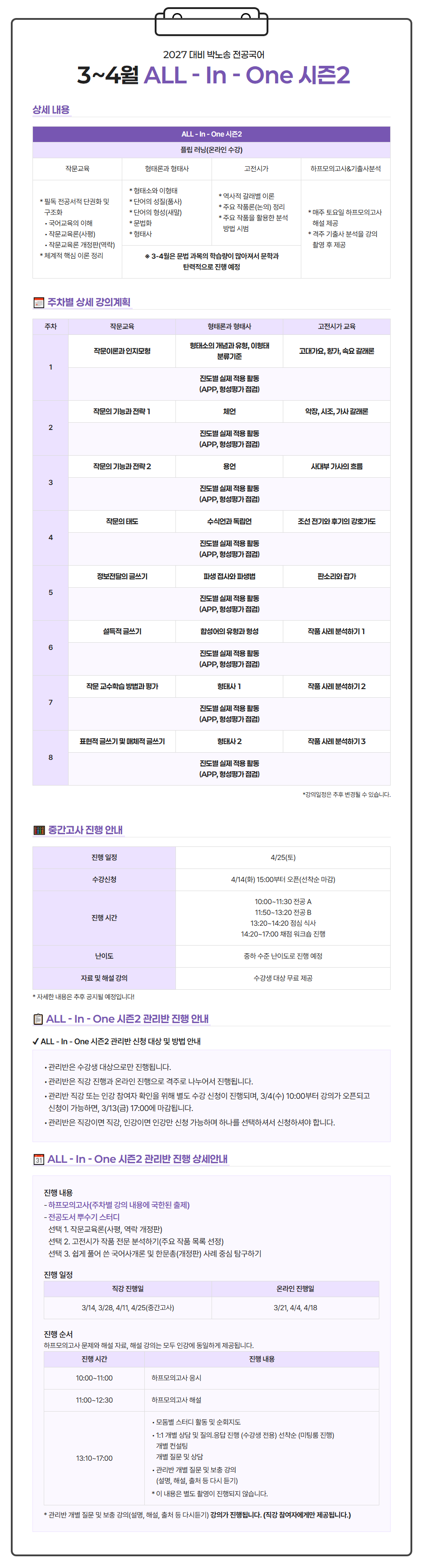 [G스쿨][박노송 전공국어] 3~4월 ALL IN ONE 시즌 2 강의계획 안내! 접수 시작! 작성자G스쿨|작성시간26.02.06|조회수78 목록 댓글 0 글자크기 작게가 글자크기 크게가 안녕하세요. G스쿨입니다. 3~4월 상세 강의계획 안내드립니다! [수강 신청 바로 가기] 다음검색 현재 게시글 추가 기능 열기 북마크 신고 센터로 신고 댓글 댓글 0 댓글쓰기 답글쓰기 댓글 리스트