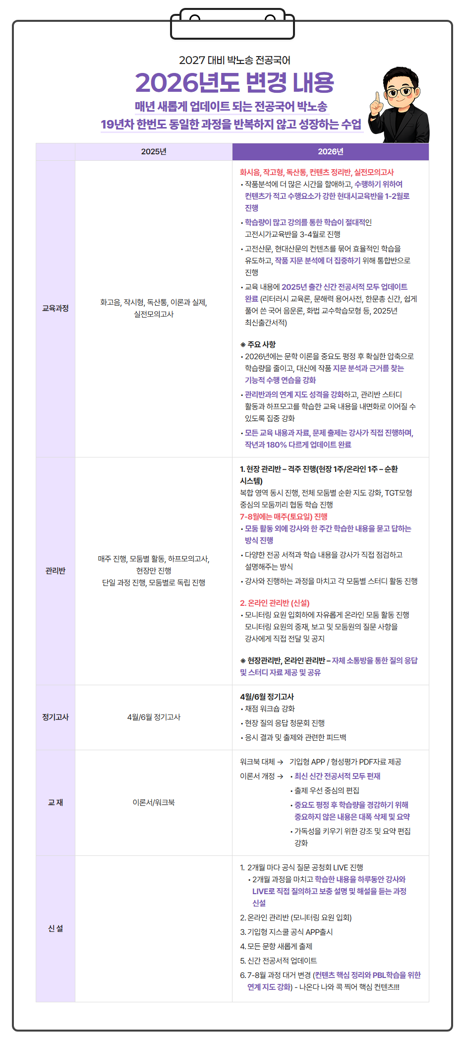 [G스쿨] [박노송 전공국어] 2027학년는 다릅니다! 합격자의 추천 인터뷰까지! 작성자G스쿨|작성시간26.02.20|조회수48 목록 댓글 0 글자크기 작게가 글자크기 크게가 안녕하세요. G스쿨입니다. 매년 성장하는 새로운 커리큘럼으로 업그레이드 되는 노송쌤의 2027학년 대비 변경 사항을 지금 확인해 보세요![2027학년도 커리큘럼 확인하기][2027학년도 수강 신청 바로 가기] 매년 수많은 합격자를 배출하는 합격스토리도 함께 확인하세요! 다음검색 현재 게시글 추가 기능 열기 북마크 신고 센터로 신고 댓글 댓글 0 댓글쓰기 답글쓰기 댓글 리스트