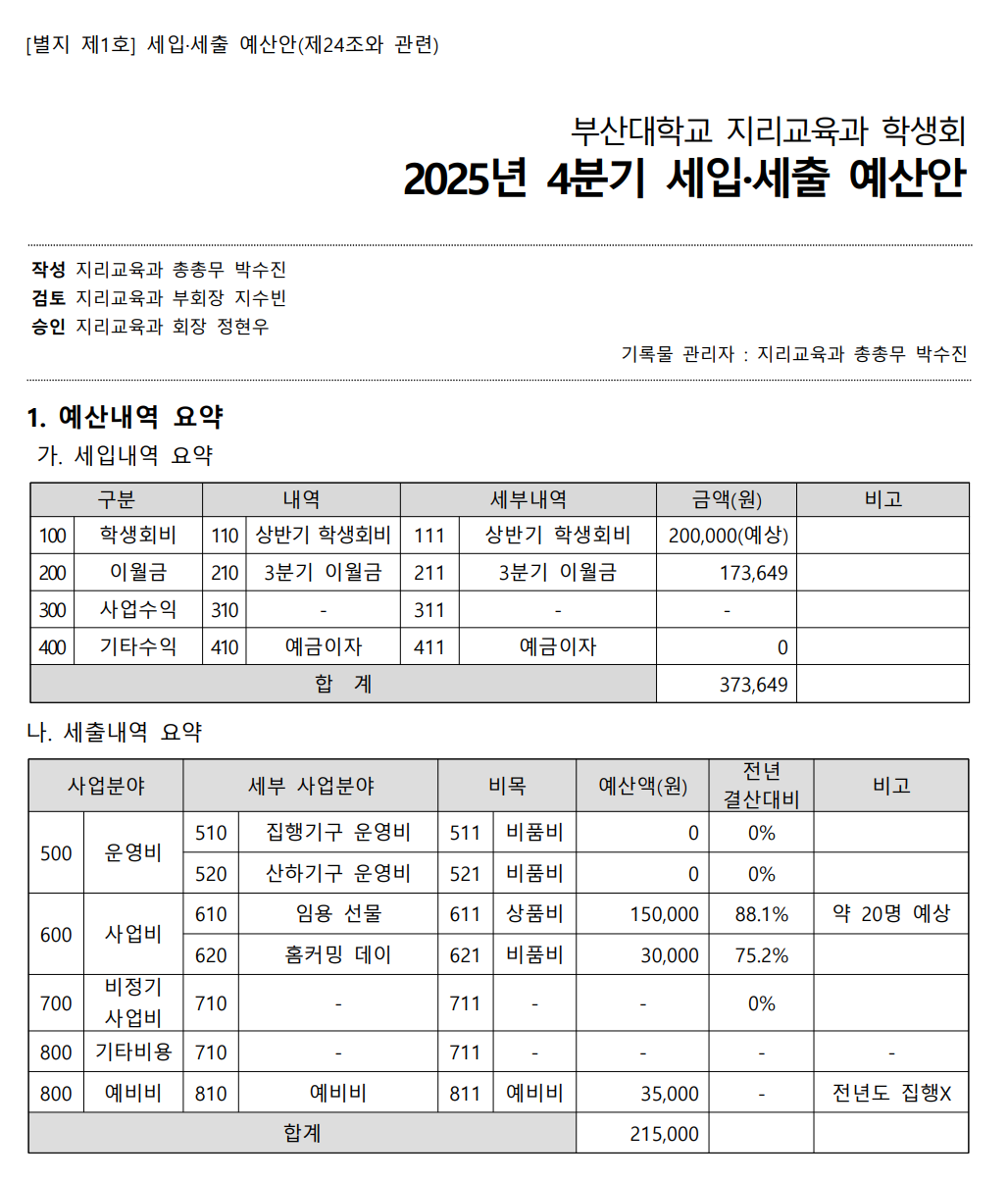 4분기 예산안입니다. 작성자23박수진|작성시간25.08.29|조회수28 목록 댓글 0 글자크기 작게가 글자크기 크게가 2025 4분기 예산안.pdf57.84KB 첨부파일첨부된 파일이 2개 있습니다. png 파일 image.png 다운로드 pdf 파일 2025 4분기 예산안.pdf 다운로드 다음검색 현재 게시글 추가 기능 열기 북마크 공유하기 신고 센터로 신고 댓글 댓글 0 댓글쓰기 답글쓰기 댓글 리스트