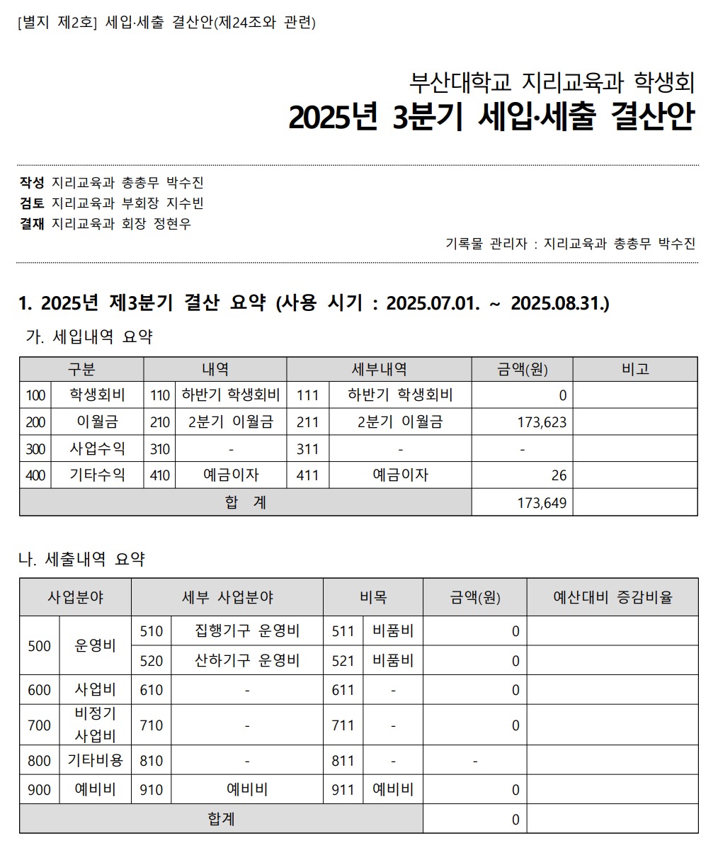 3분기 결산안 입니다. 작성자23박수진|작성시간25.09.08|조회수50 목록 댓글 0 글자크기 작게가 글자크기 크게가 2025 3분기 결산안.pdf63.05KB 첨부파일첨부된 파일이 2개 있습니다. png 파일 image.png 다운로드 pdf 파일 2025 3분기 결산안.pdf 다운로드 다음검색 현재 게시글 추가 기능 열기 북마크 공유하기 신고 센터로 신고 댓글 댓글 0 댓글쓰기 답글쓰기 댓글 리스트