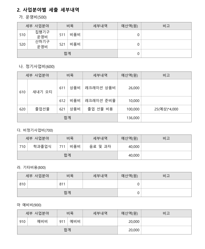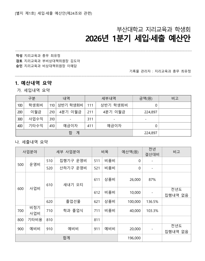 2026학년도 1분기 예산안입니다. 작성자24최유정|작성시간25.12.18|조회수21 목록 댓글 0 글자크기 작게가 글자크기 크게가 안녕하십니까 2026학년도 총총무 최유정입니다. 2026 1분기 예산안 작성을 완료했습니다. 궁금하신 사항 있으시면 010-2549-9692로 연락주시길 바랍니다! 2026 1분기 예산안.pdf63.06KB 첨부파일첨부된 파일이 3개 있습니다. etc 파일 IMG_7289.PNG 다운로드 etc 파일 IMG_7290.PNG 다운로드 pdf 파일 2026 1분기 예산안.pdf 다운로드 다음검색 현재 게시글 추가 기능 열기 북마크 공유하기 신고 센터로 신고 댓글 댓글 0 댓글쓰기 답글쓰기 댓글 리스트