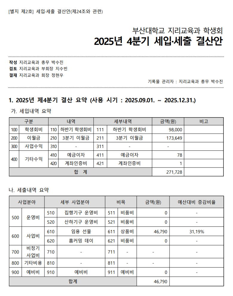 4분기 결산안 입니다. 작성자23박수진|작성시간26.01.01|조회수27 목록 댓글 0 글자크기 작게가 글자크기 크게가 2025년도 4분기 결산안입니다. 궁금하신 사항이 있으시면 010-9895-6533으로 따로 연락주시면 됩니다.2025 4분기 결산안.pdf117.46KB 첨부파일첨부된 파일이 2개 있습니다. png 파일 image.png 다운로드 pdf 파일 2025 4분기 결산안.pdf 다운로드 다음검색 현재 게시글 추가 기능 열기 북마크 공유하기 신고 센터로 신고 댓글 댓글 0 댓글쓰기 답글쓰기 댓글 리스트