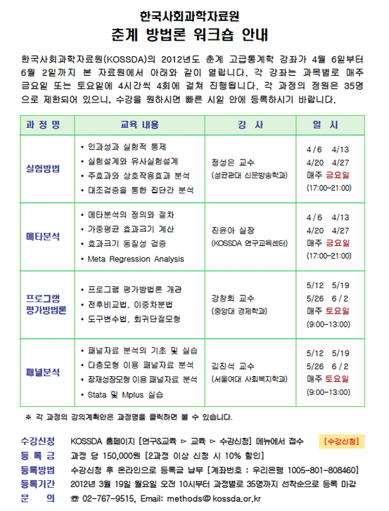 * 다중회귀분석은 매년 2회, 춘계와 추계에 개설되나 다른 강좌들은 춘계 또는 추계에 1회씩 개설됩니다. |