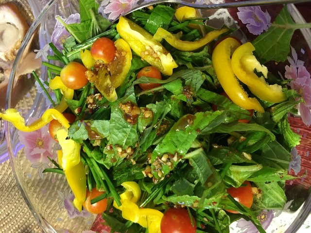부추 상추 꺳잎 잘게 썰고 노랑 파프리카와 토마토 넣어 셀러드 드레싱 휘리릭~~~~