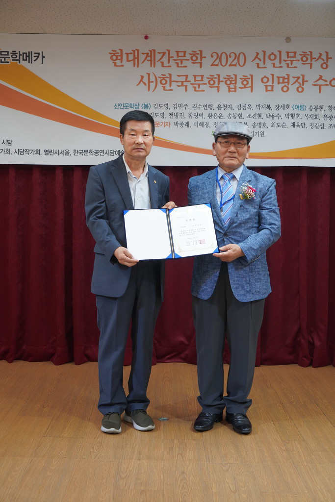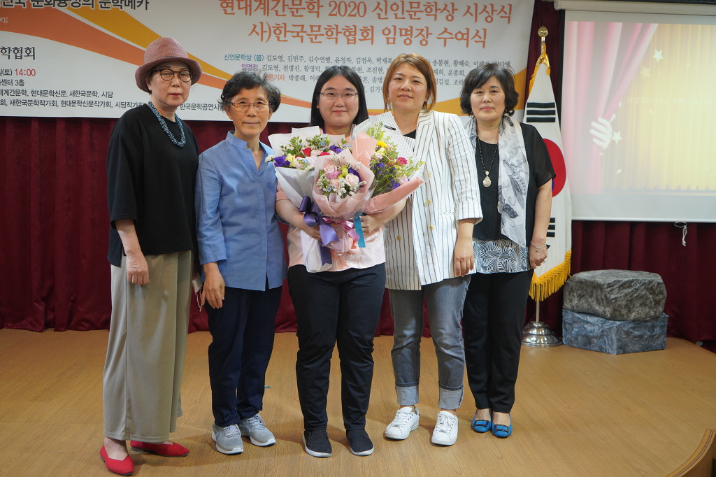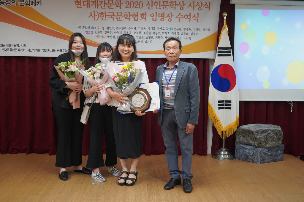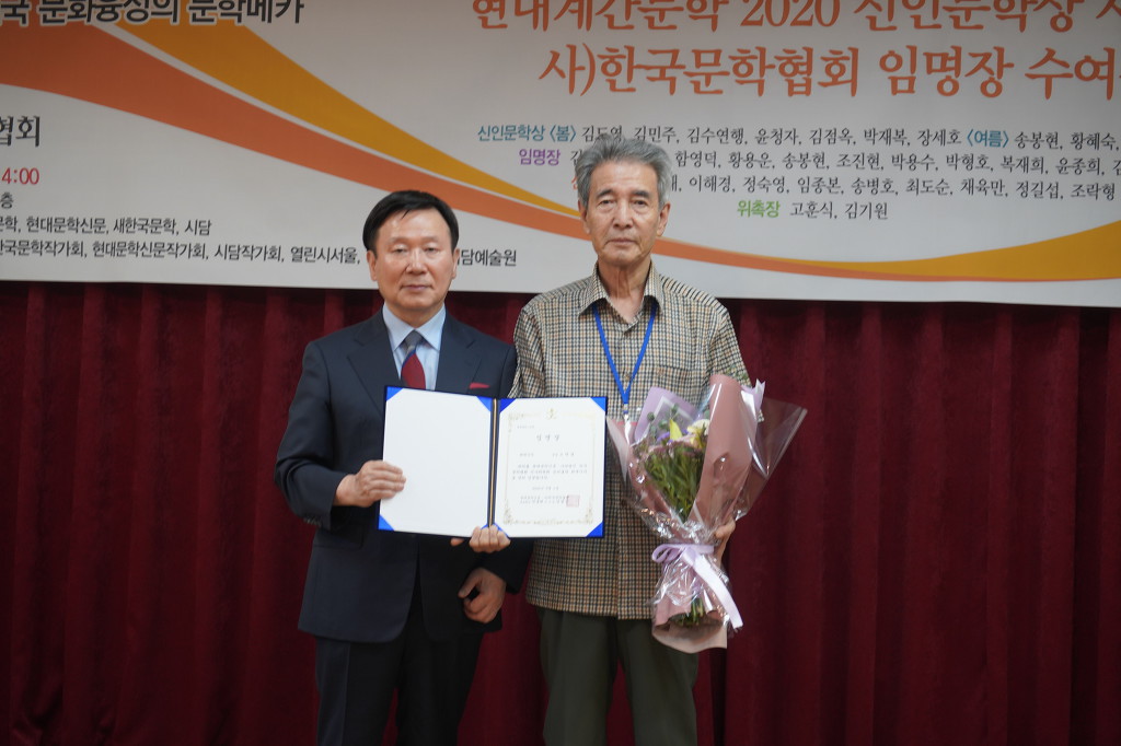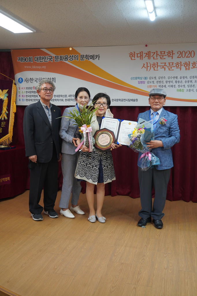 년4회 모집하는 현대계간문학 신인문학상 작품공모에 신인작가들이 계속 응모를 하고 있는데 이번 응모에서도 심사위원들의 고심이 많았다. 어려운 심사에 통과하여 수상하신 분들을 ‘코로나19’의 영향으로 시상을 미뤄오다가 이번에 봄호와 여름호를 함께 시상하게 되었다.