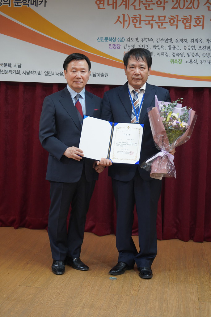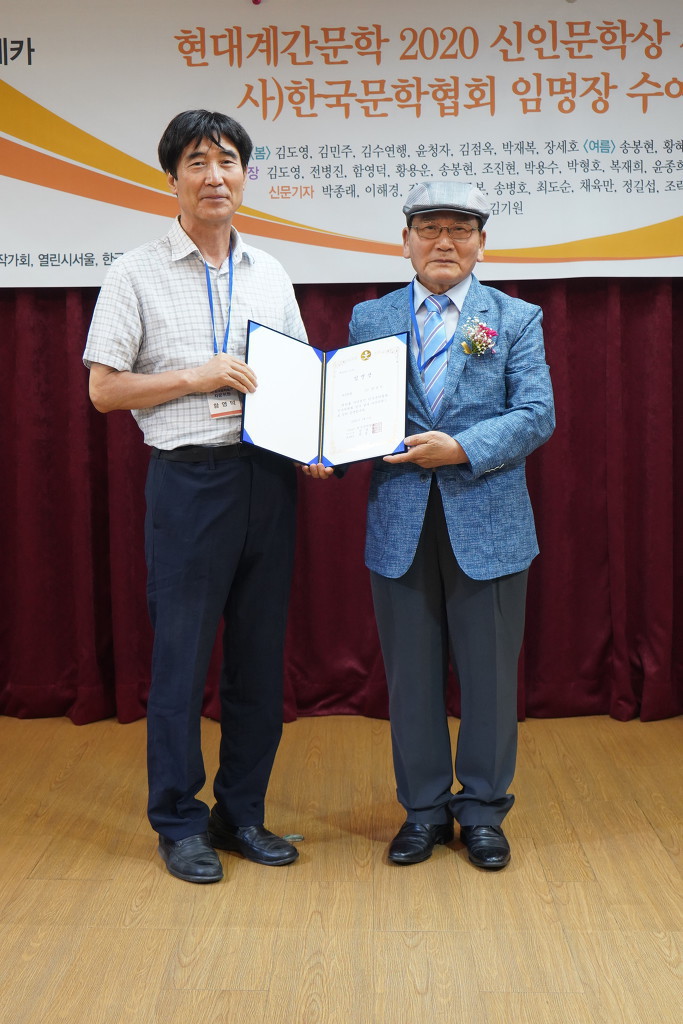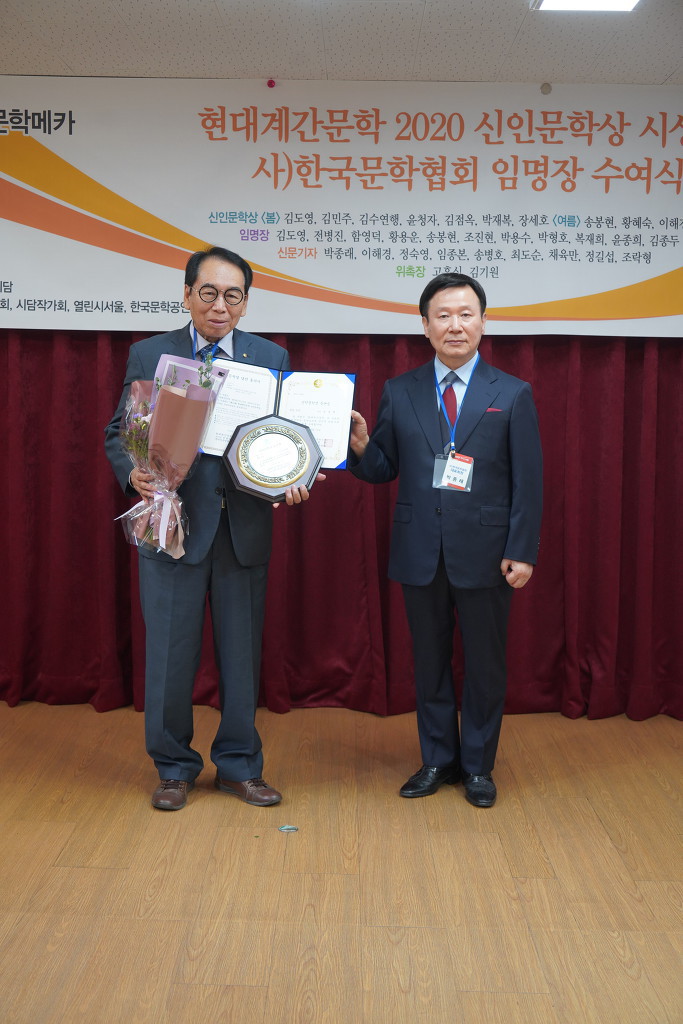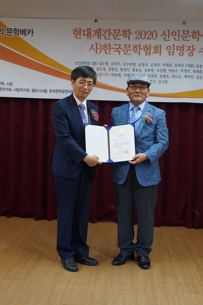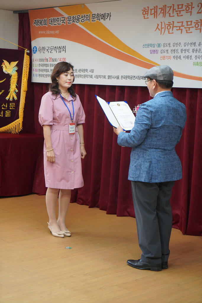 년4회 모집하는 현대계간문학 신인문학상 작품공모에 신인작가들이 계속 응모를 하고 있는데 이번 응모에서도 심사위원들의 고심이 많았다. 어려운 심사에 통과하여 수상하신 분들을 ‘코로나19’의 영향으로 시상을 미뤄오다가 이번에 봄호와 여름호를 함께 시상하게 되었다.
