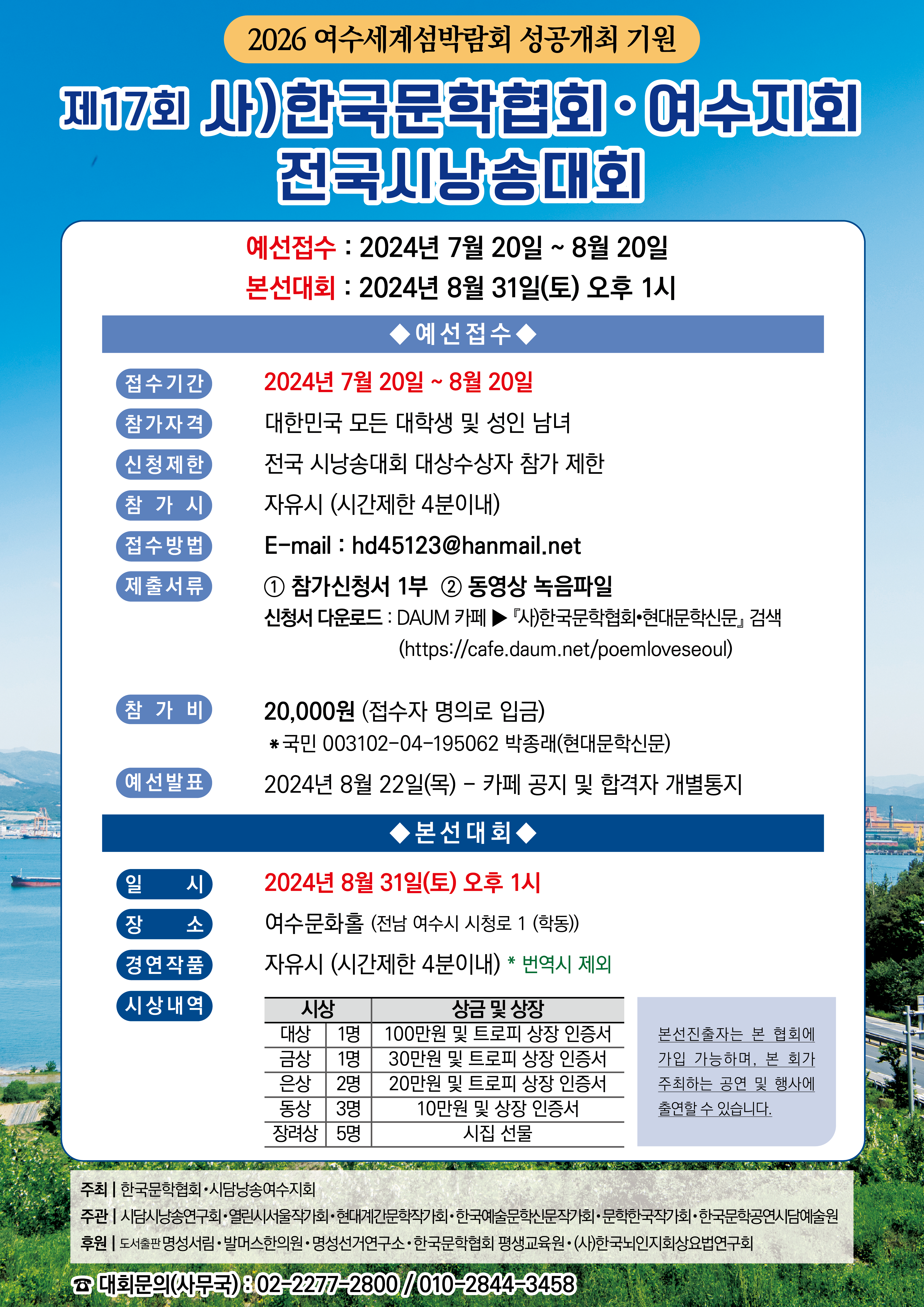 제17회 사)한국문학협회·여수지회 전국시낭송대회 참가신청서 작성자박주이|작성시간24.06.24|조회수194 목록 댓글 0 글자크기 작게가 글자크기 크게가 제17회 사)한국문학협회·여수지회 전국시낭송대회 참가신청서.hwp55.00KB 첨부파일첨부된 파일이 2개 있습니다. png 파일 KakaoTalk_20240624_104629375.png 다운로드 hwp 파일 제17회 사)한국문학협회·여수지회 전국시낭송대회 참가신청서.hwp 다운로드 다음검색 현재 게시글 추가 기능 열기 북마크 공유하기 신고 센터로 신고 댓글 댓글 0 댓글쓰기 답글쓰기 댓글 리스트