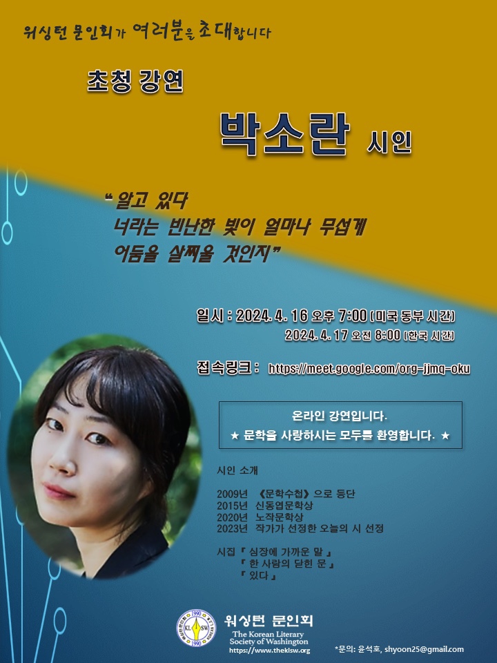 워싱톤 문인회 초대강연/ 박소란 시인 작성자시산맥|작성시간24.04.16|조회수39 목록 댓글 0 글자크기 작게가 글자크기 크게가 다음검색 현재 게시글 추가 기능 열기 북마크 공유하기 신고 센터로 신고 댓글 댓글 0 댓글쓰기 답글쓰기 댓글 리스트
