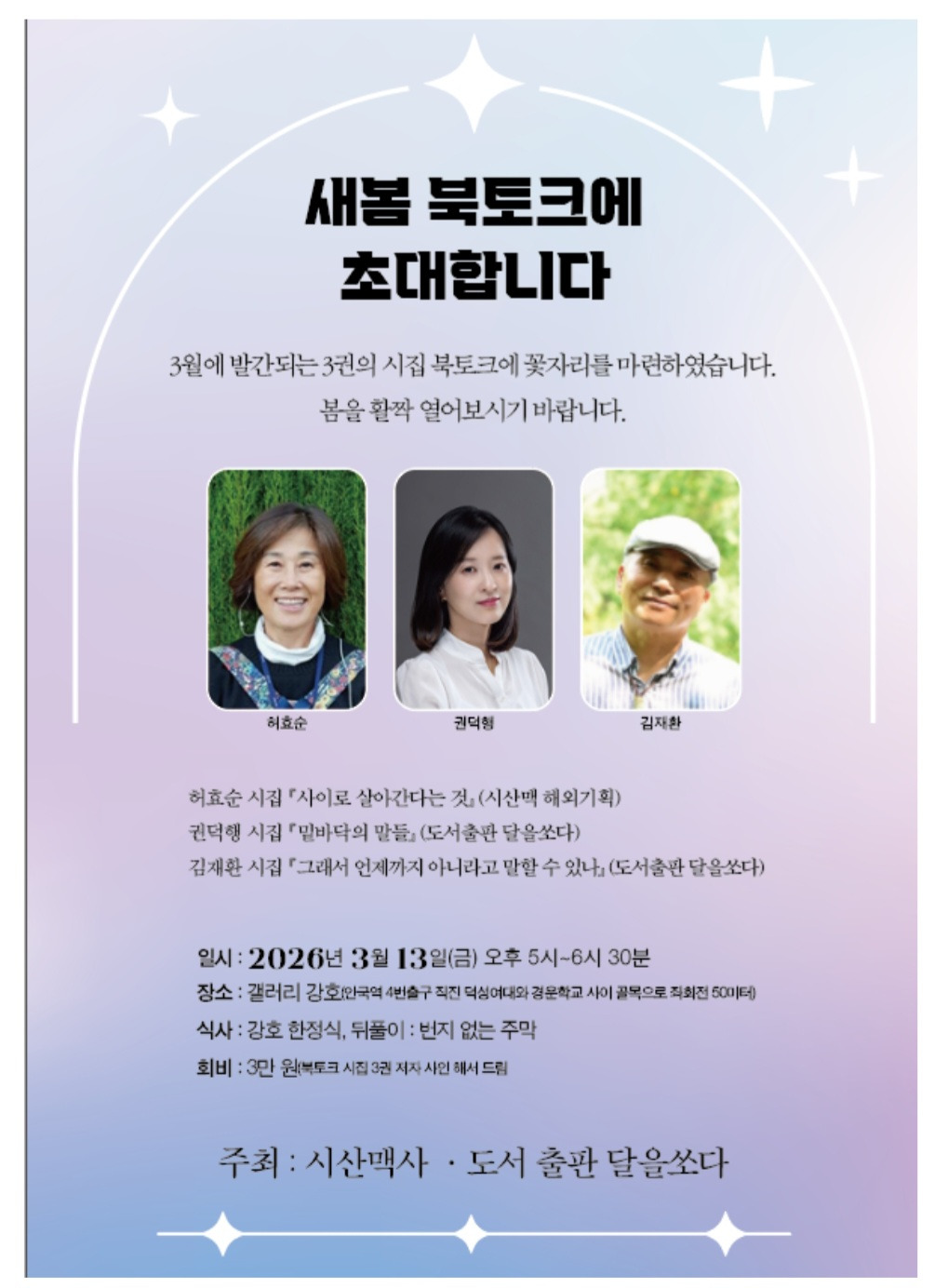 3인 북토크(2026.03.13) 작성자이율|작성시간26.03.14|조회수75 목록 댓글 0 글자크기 작게가 글자크기 크게가 다음검색 현재 게시글 추가 기능 열기 북마크 신고 센터로 신고 댓글 댓글 0 댓글쓰기 댓글 리스트