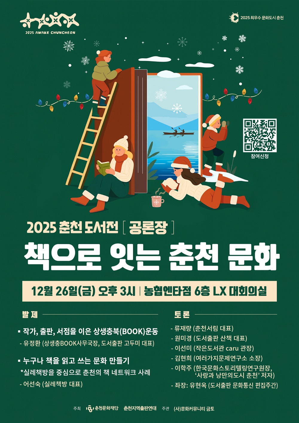 2025춘천도서전_책속의 춘천 12/25~27일, 열립니다 작성자문화통신|작성시간25.12.24|조회수7 목록 댓글 0 글자크기 작게가 글자크기 크게가 다음검색 현재 게시글 추가 기능 열기 북마크 신고 센터로 신고 댓글 댓글 0 댓글쓰기 답글쓰기 댓글 리스트