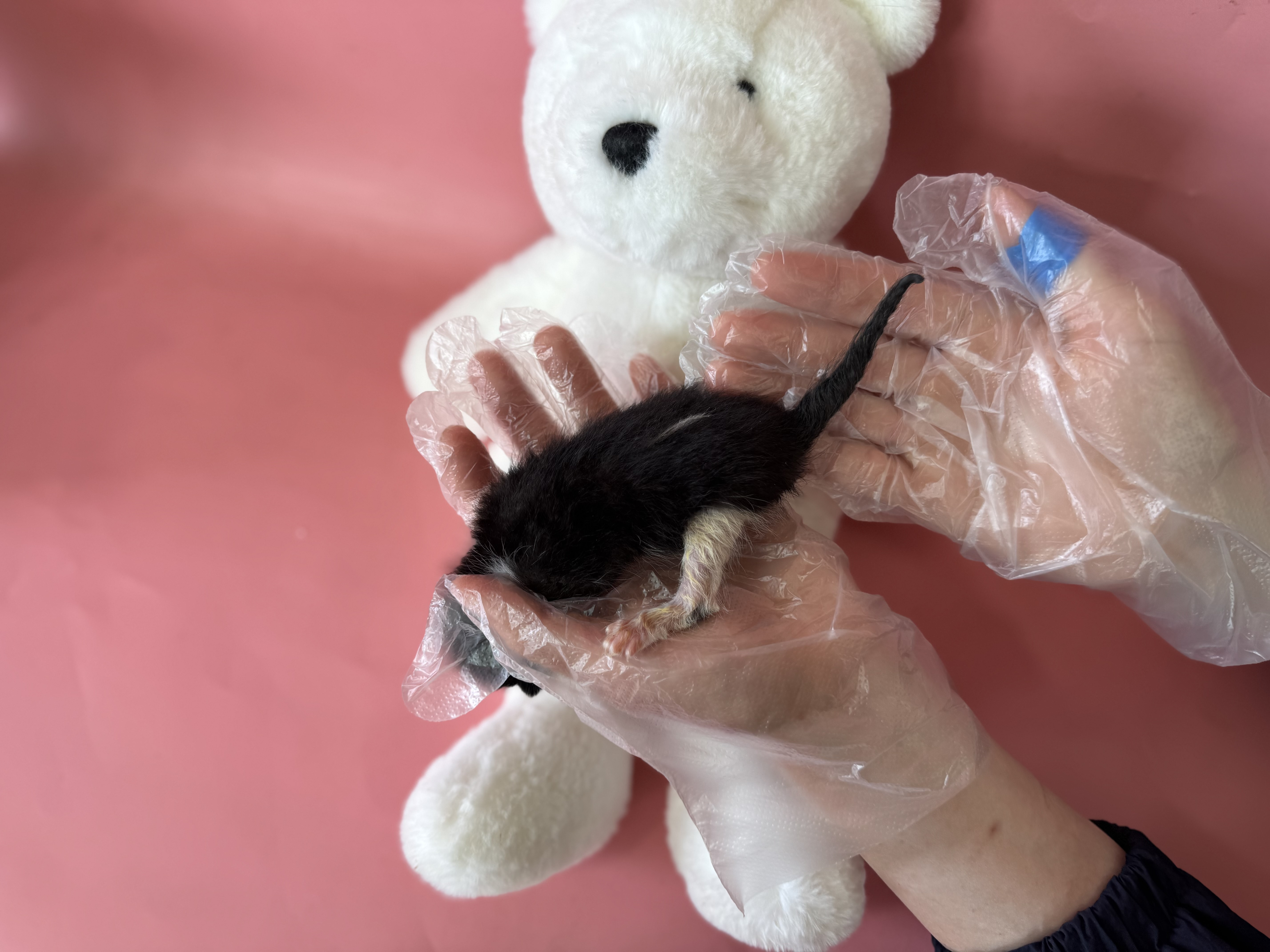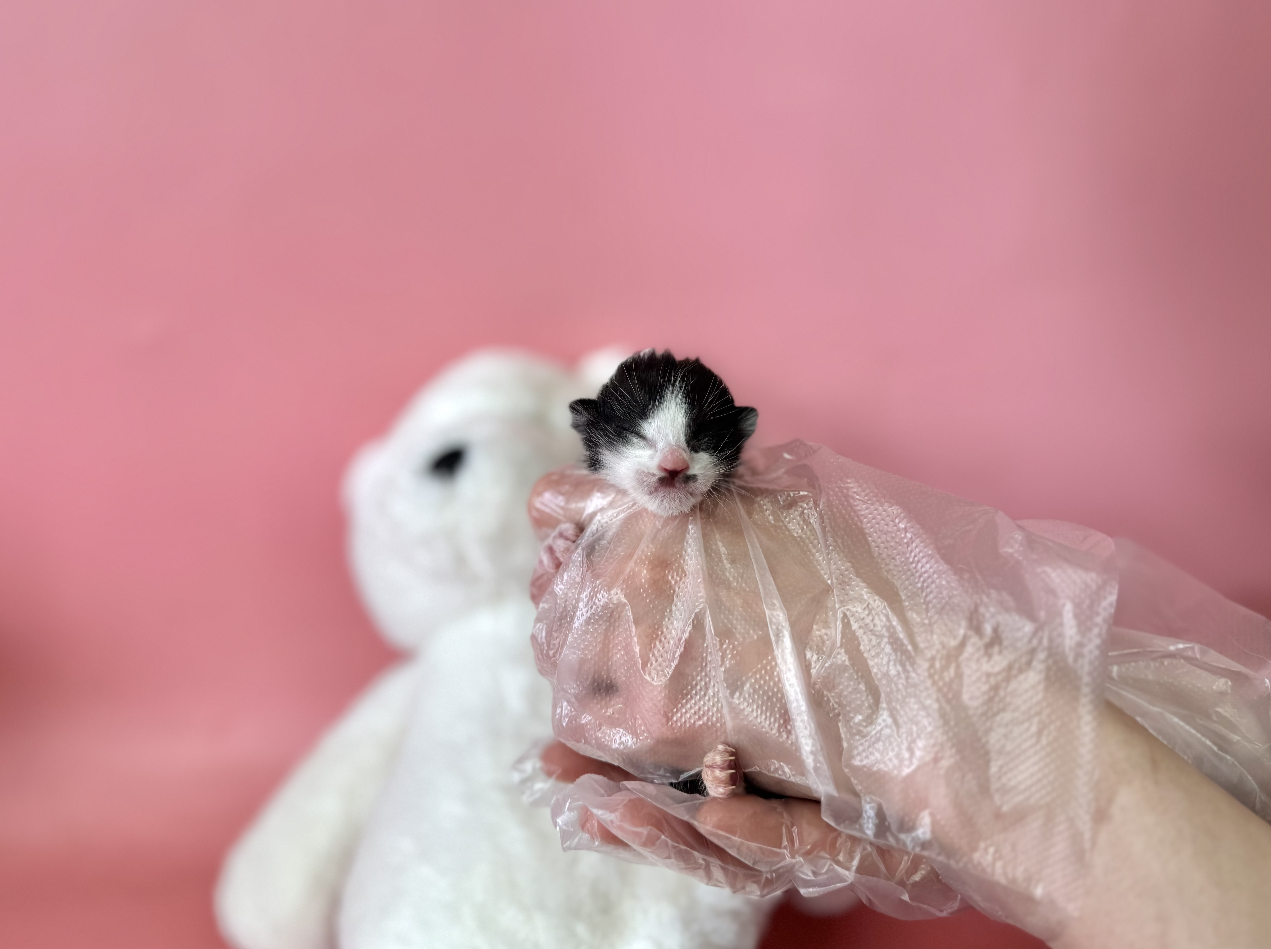 특징: 2주 추정,꼬리 끝이 약간 꺽여 있는 콧수염 있는 턱시도 왕자님,핑크색 코에 약간 잉크가 묻은듯한 색