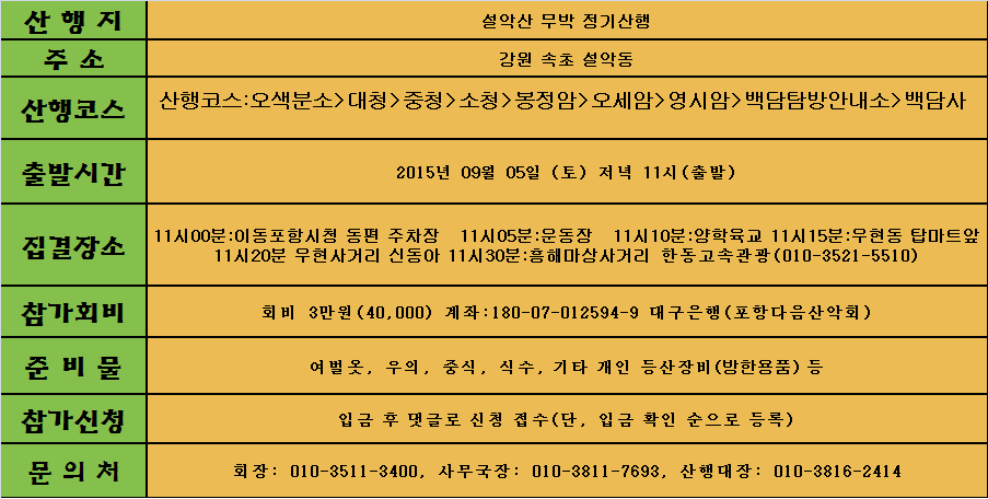 다음산악회 142차 9월 설악산 무박 정기산행 안내