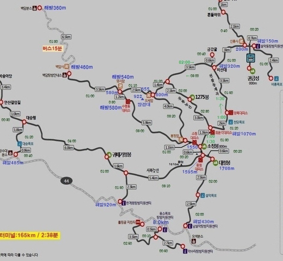 산행코스:오색분소>대청>중청>소청>봉정암>오세암>영시암>백담탐방안내소>백담사