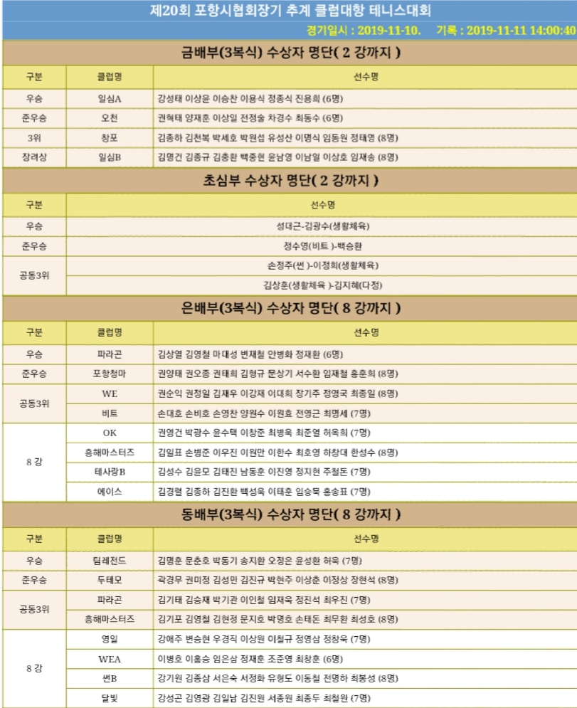 제20회 추계 협회장배 클럽대항 테니스대회결과 작성자박찬욱|작성시간19.11.11|조회수181 목록 댓글 0 글자크기 작게가 글자크기 크게가 대회결과 다음검색 현재 게시글 추가 기능 열기 북마크 공유하기 신고 센터로 신고 댓글 댓글 0 댓글쓰기 답글쓰기 댓글 리스트