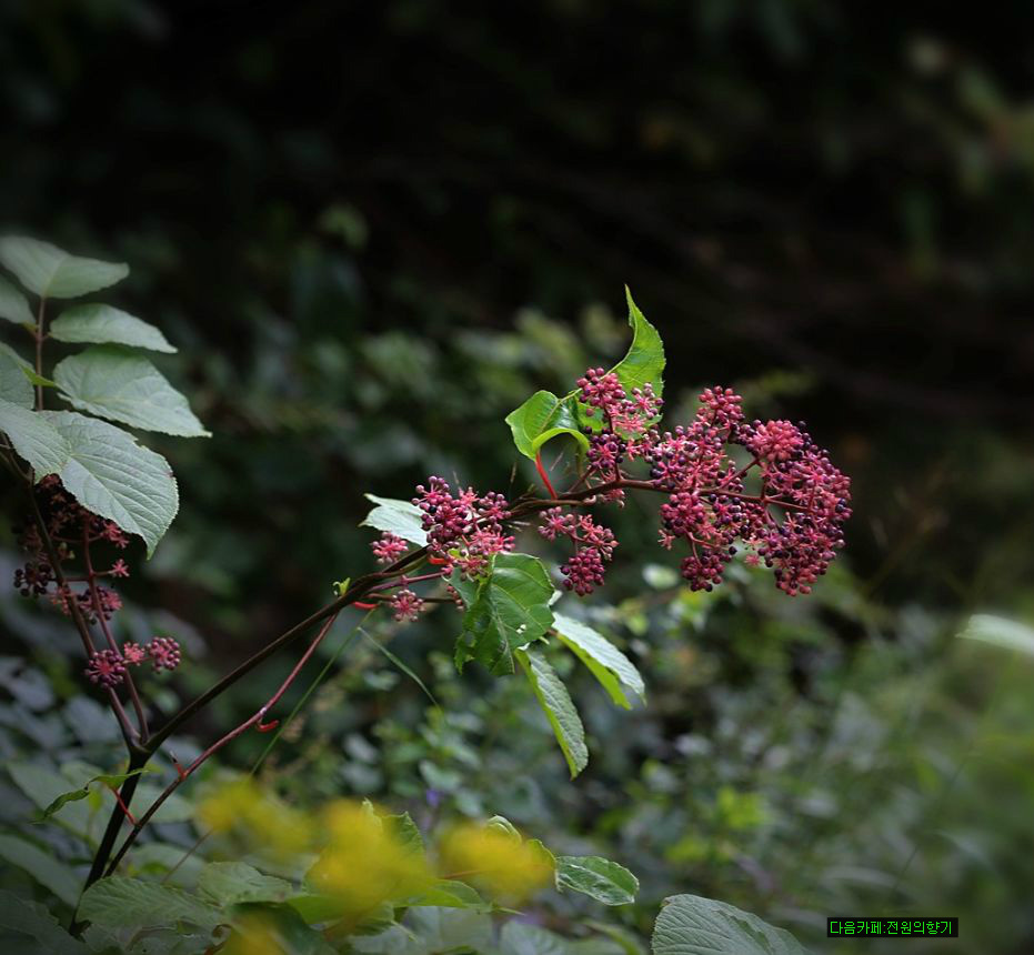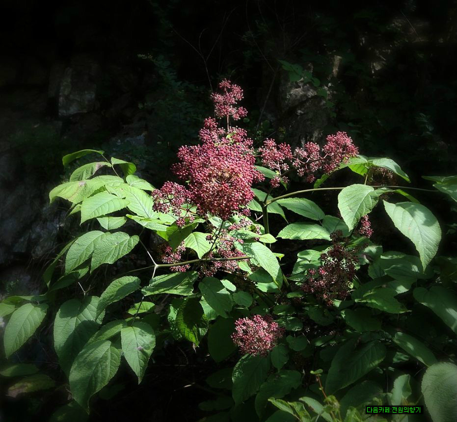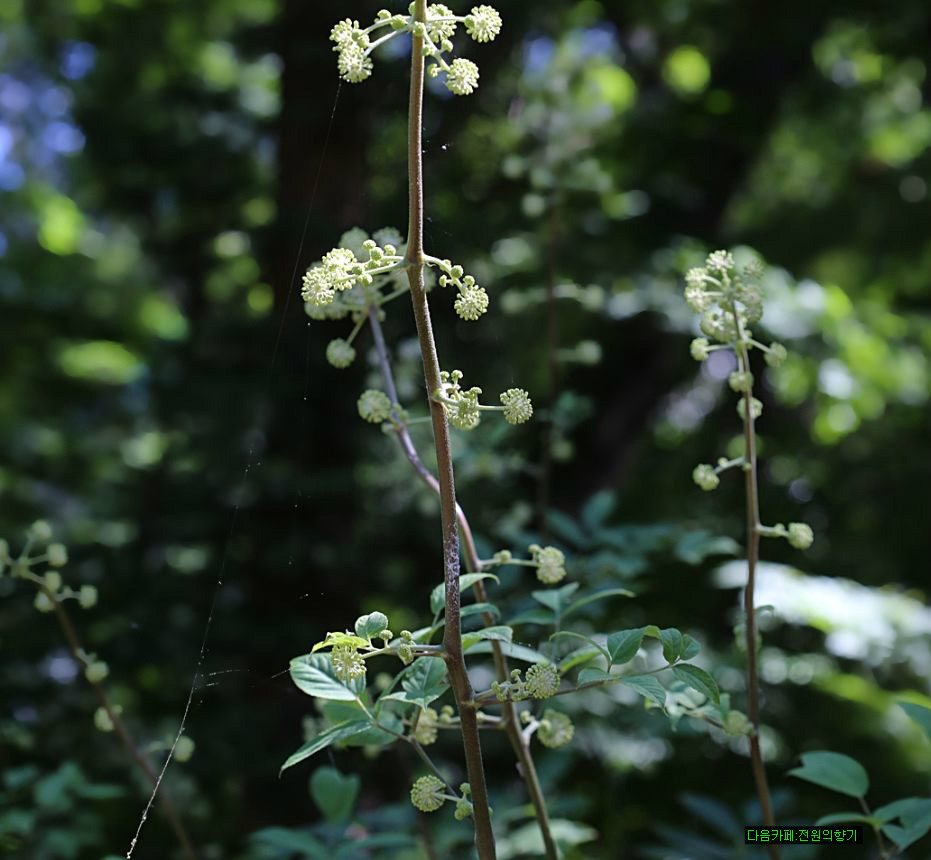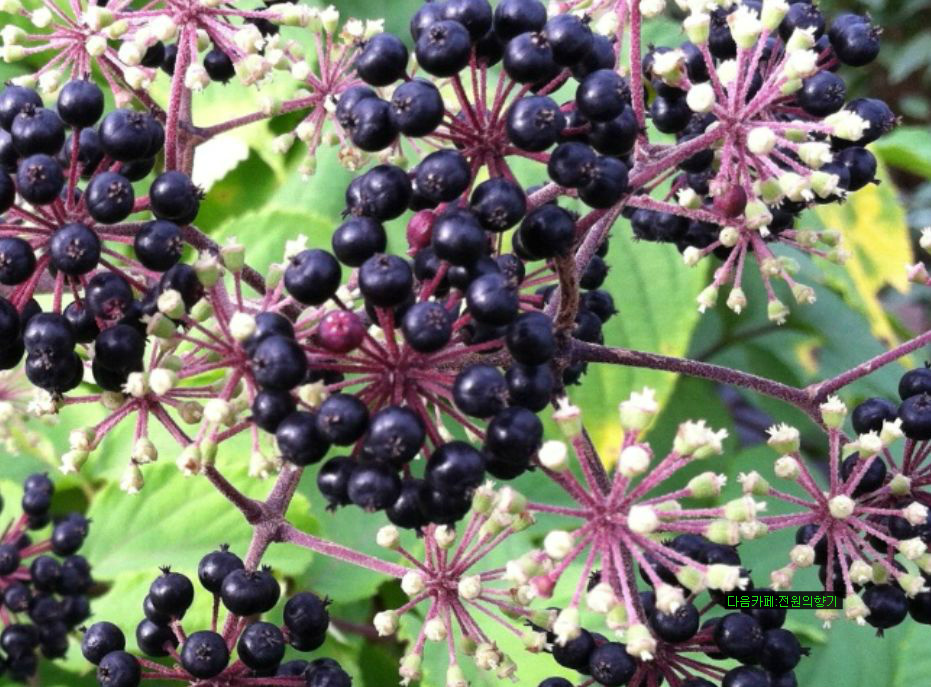 7~8월에 연한 풀색의 꽃색이 둥글게 피어 9~10월에는 검은색의 둥근 열매를 맺는다.