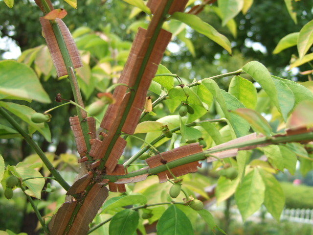 키는 3미터쯤 자라고 가지는 사방으로 퍼지며 초록색 어린 가지에 이 나무의 최대 특징인