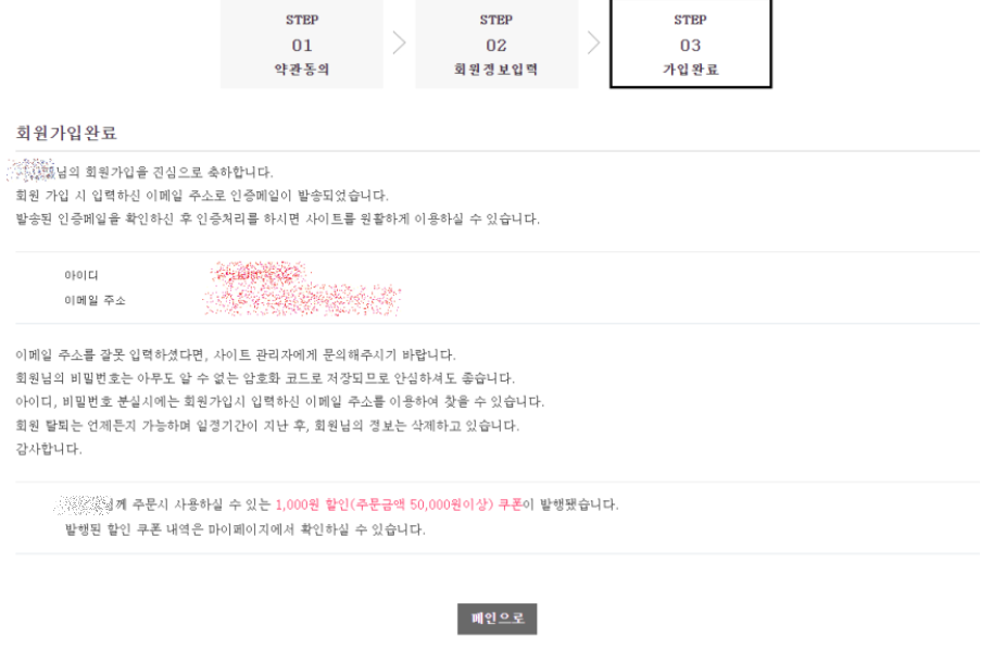 가입완료 창에 만드셨던 아이디가 제대로 기입이 되었었다면 성공입니다!