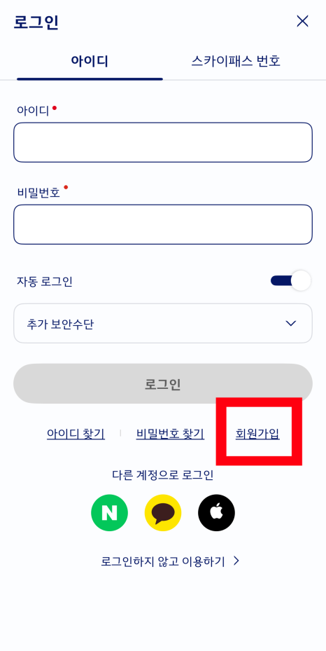 우선 '대한항공' 어플을 다운로드 받으면 로그인하는 화면이 뜹니다.