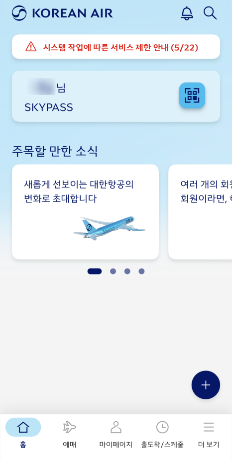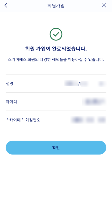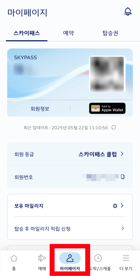 스카이패스 회원 등급과 회원번호를 확인할 수 있고,