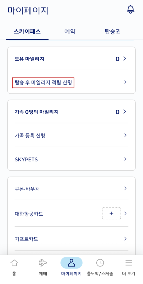 2. 기본 홈화면에서 가운데 하단에 있는 마이페이지에서 마일리지 확인