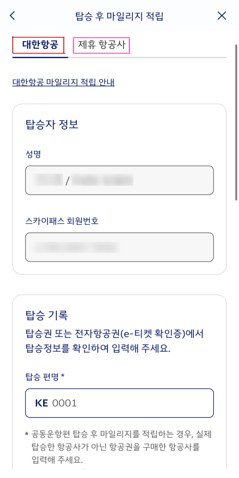 마일리지 적립을 하실 때 스카이패스 회원번호를 복사한 후