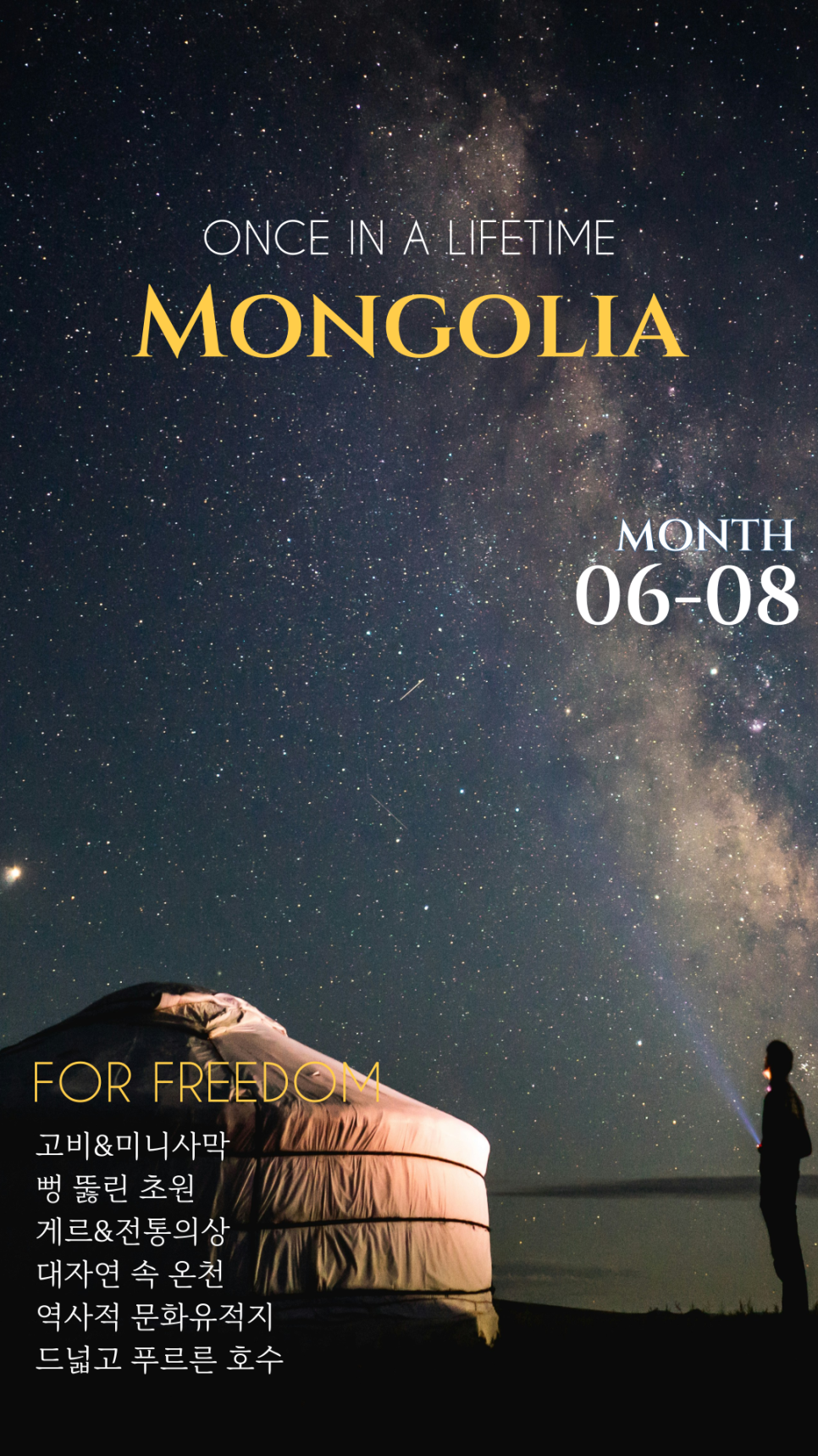 진정한 자유를 원한다면, 숨이 탁 트이는 몽골로의 여행을 추천드립니다.