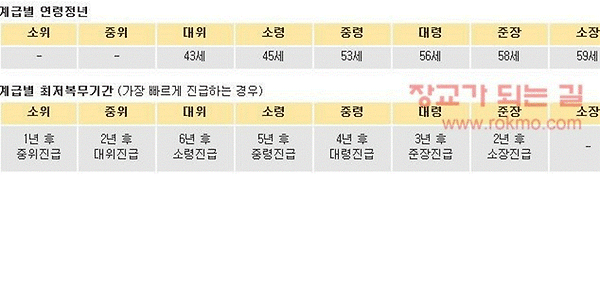 -근속 정년 : 대령(35년), 중령(32년), 소령(24년), 대위이하(15년), 준위(32년)